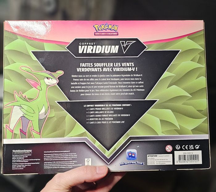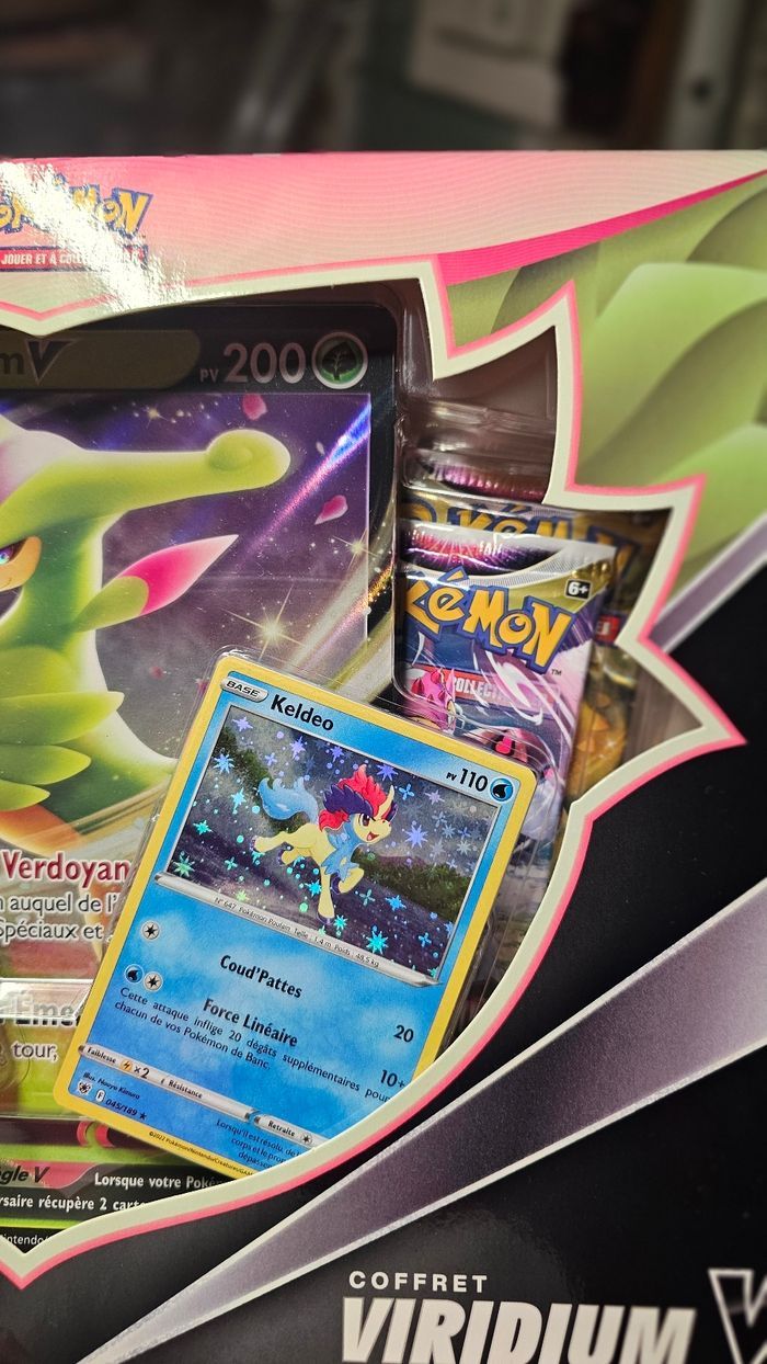 Coffret Pokemon Viridium 4 boosters parfaitement scellé Envoi soigné Ce produit contient : - 2 cartes promo brillantes: VIRIDIUM V et KELDEO holographique - 1 carte Jumbo brillante de VIRIDIUM V - 4 boosters du JCC Pokémon en français (2x Astre Radieux + 2x Origine perdue) - 1 carte à code pour le JCC Pokémon Online