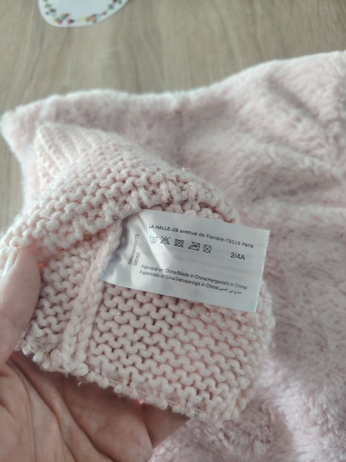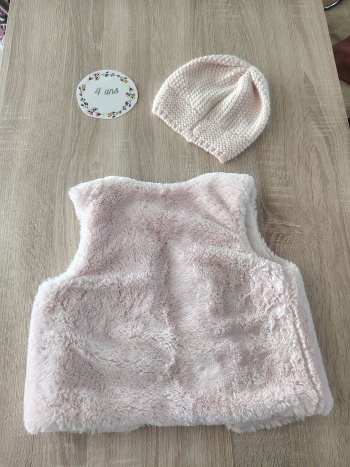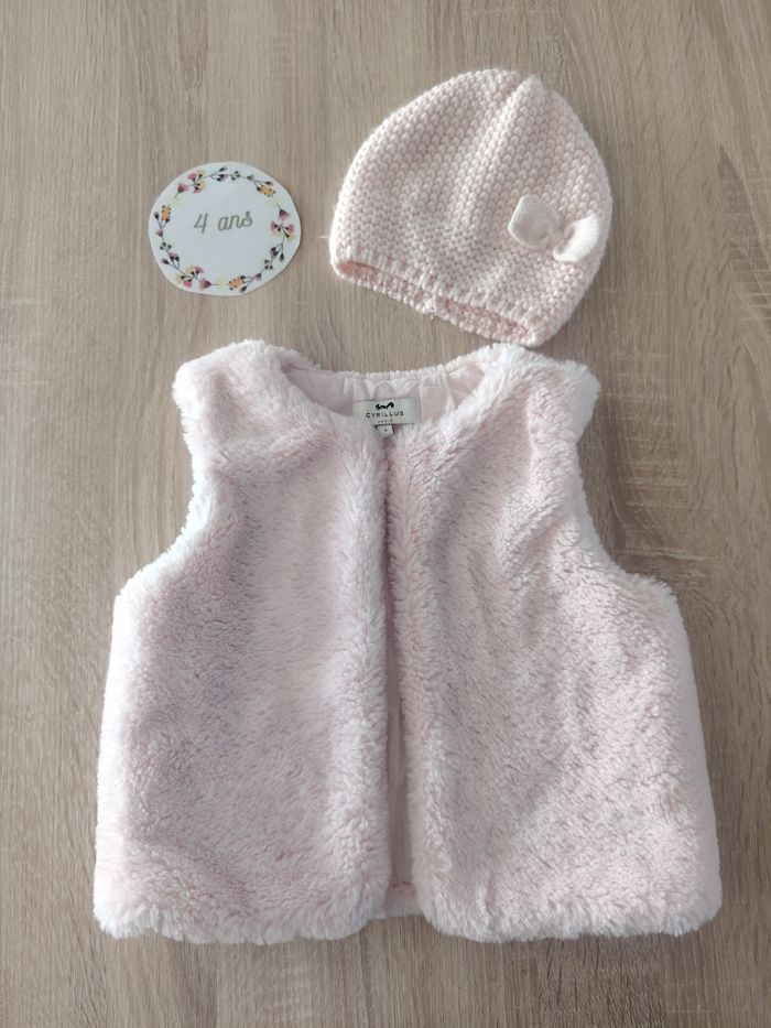 Veste sans manches en fausse fourrure rose pâle intérieur en coton. Elle est en très bon état c'est une taille 4 ans de la marque Cyrillus. J'offre le bonnet sur la photo.