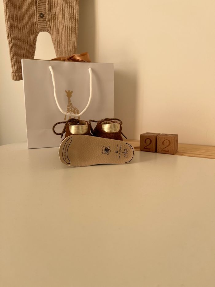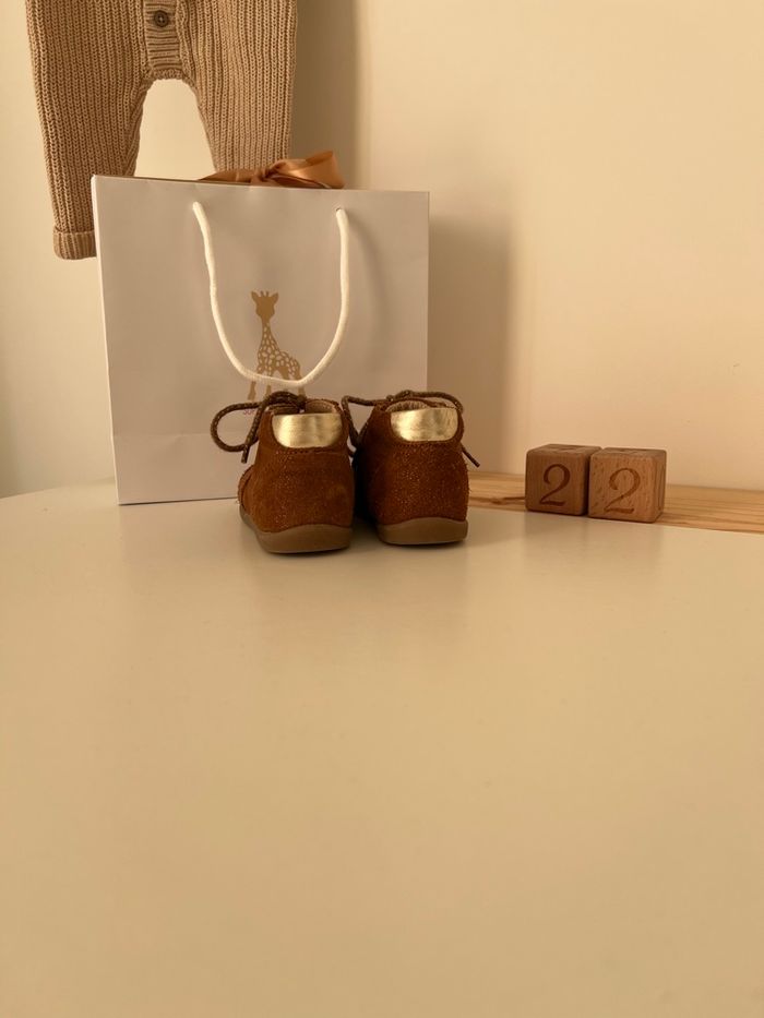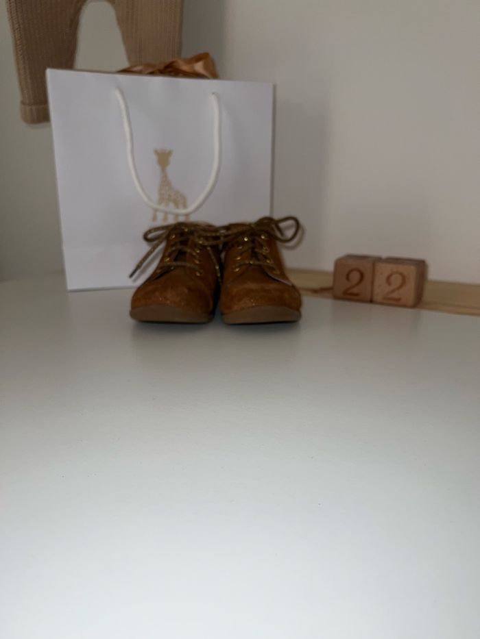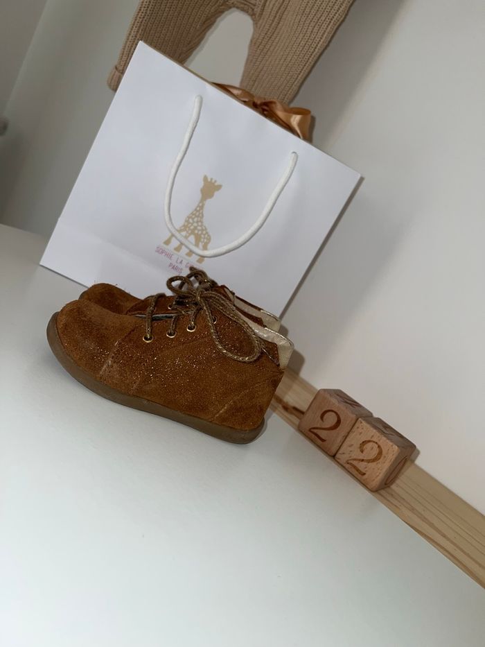 Chaussures de marche en taille 22 🧸 Bon état, porté deux mois ✨ Semelle souple et chaussure ergonomique, parfait pour la marche de votre enfant. La semelle est amovible avec un repère afin de vérifier la bonne taille pour votre enfant. Encore vendu 35 euros dans le commerce.