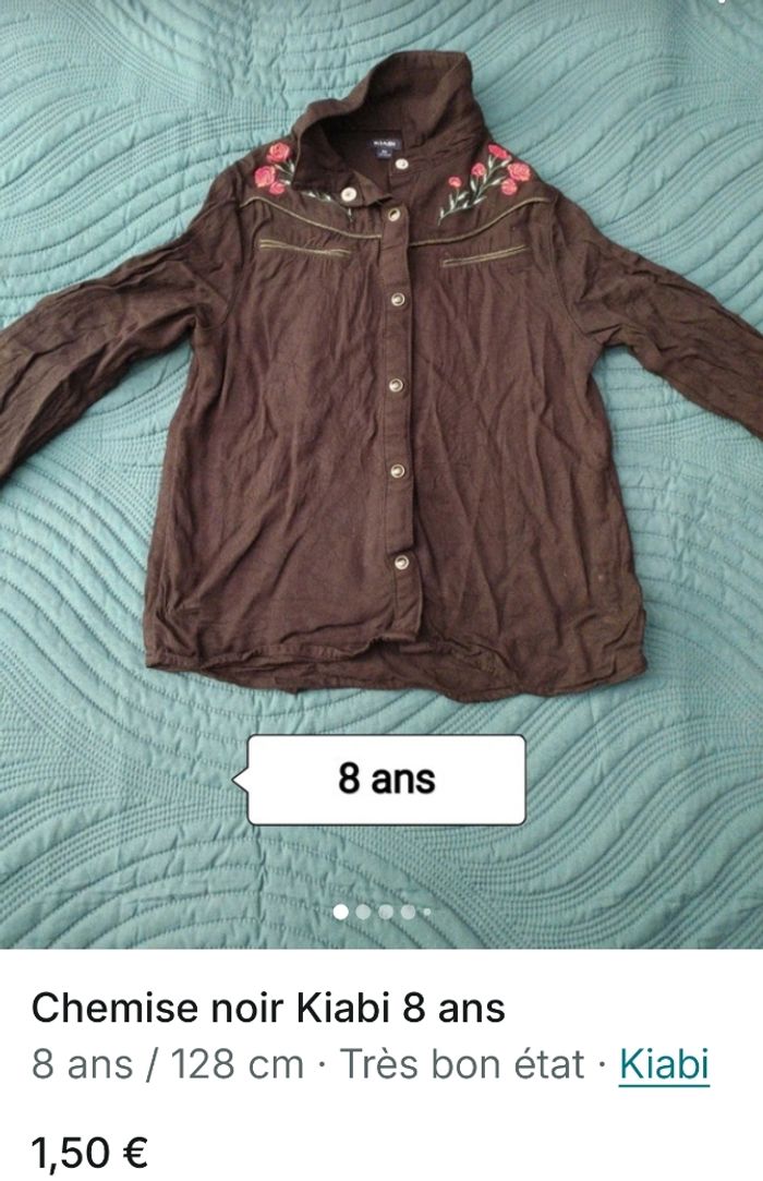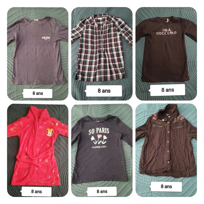 Bonjour vend Lot de vêtements 8 ans Un peignoir , deux chemise , une robe, deux t-shirts entre 1.5€ et 4€ pieces *Offre 8€ le lot ou prix a l'unité * N'hésitez si vous souhaitez plus de photos ou informations