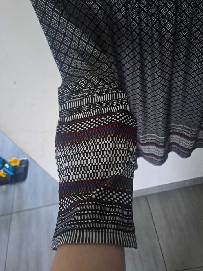 Tunique / Blouse Fluide et légère Manches longues Col légèrement carré Fentes dans le bas Couleur noir à petits points blanc et multicolore dans le bas et au manches Taille 3 Pas d'étiquette de marque