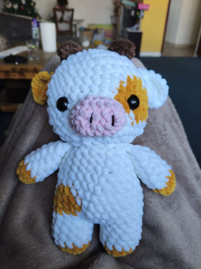Craquez pour cette adorable petite vache réalisée entièrement à la main au crochet, avec une laine ultra douce effet velours. Son toucher moelleux et son style tout mignon en font le compagnon parfait pour les petits comme pour les grands 💛 ✨ Détails : Fait main avec soin Laine chenille toute douce Yeux de sécurité Rembourrage moelleux Couleurs : blanc, taches caramel, museau rose Pièce unique / fabrication artisanale 🎁 Idéale comme cadeau de naissance, décoration de chambre, ou tout simplement pour faire fondre les cœurs. 💡 Chaque création étant faite à la main, de légères différences peuvent exister, ce qui rend chaque peluche unique. 📦 Envoi soigné
