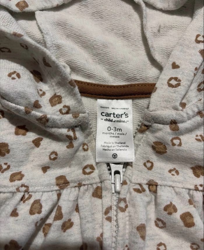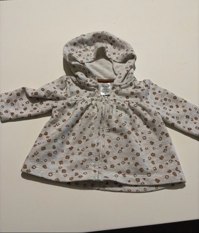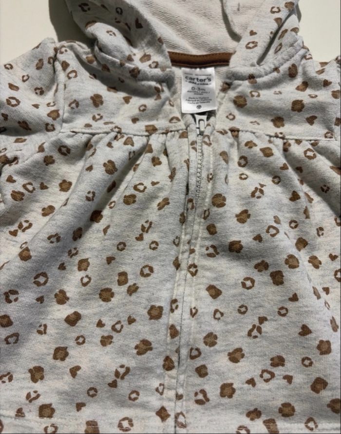 Magnifique gilet bébé – Léopard & gris 🐆🤍 Taille indiquée : 0-3 mois (correspond plutôt à un 3 mois) Marque : Carter’s Joli gilet chaud et tout doux, parfait pour les premières sorties de bébé. Motif léopard sobre et tendance, couleur gris clair qui s’accorde avec tout. Très bon état, lavé et prêt à être porté 😊 👉 Conseil taille : même si l’étiquette indique 0-3 mois, il correspond davantage à une taille 3 mois standard (voir photos). 👉 Prix : 4 €