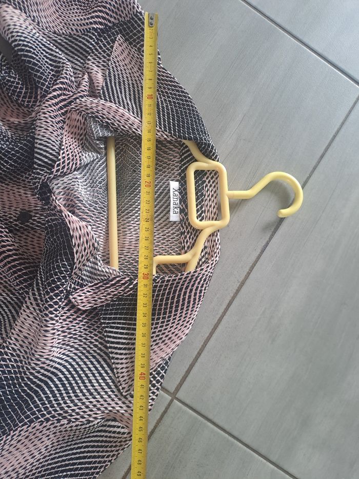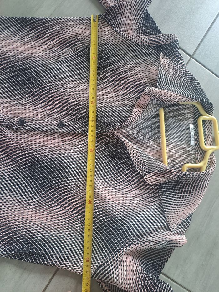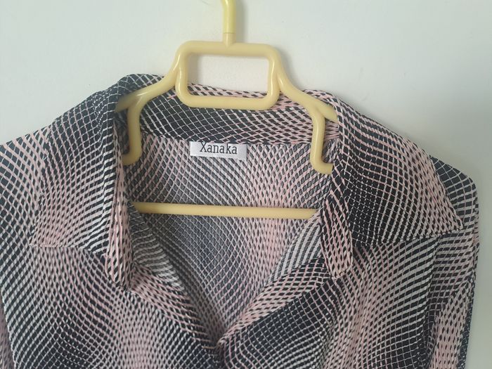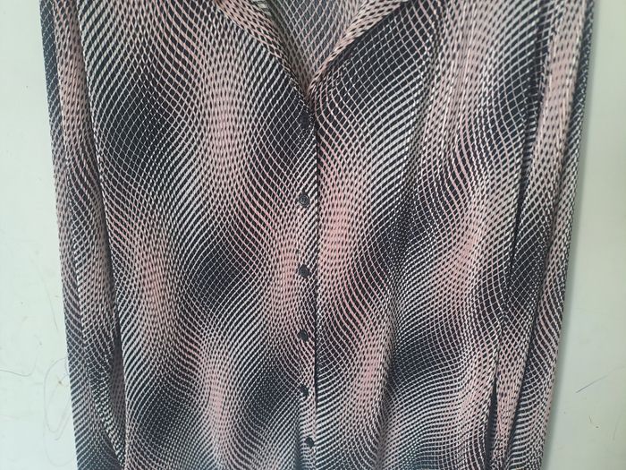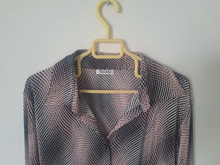 Chemise fluide et légère Manches longues avec fentes au bout des manches Attache à l'avant avec boutons Couleur Rose et Noir Pas d'étiquette de taille, mesure aisselle à aisselle 53cm, mesure épaule à épaule 46cm Marque Xanaka