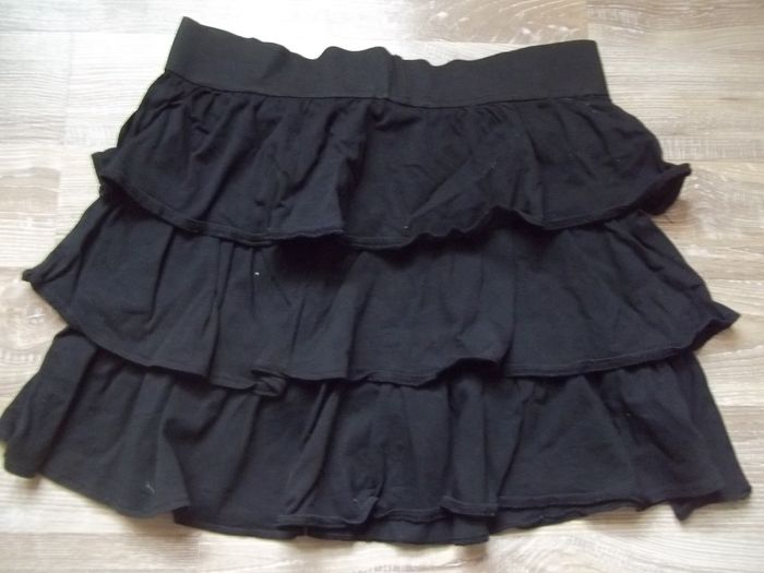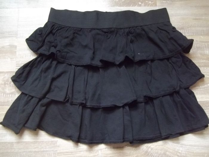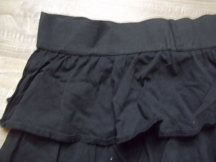 Jupe bien noire 100 % coton en 3 étages de volants, sans ouverture, élastique large à la taille (fatigué). Longueur 38 cm, largeur taille 36/37 cm. En principe 16 ans mais comme elle s'est élargie, je la classe en femme taille S (pour un début de petit ventre...).