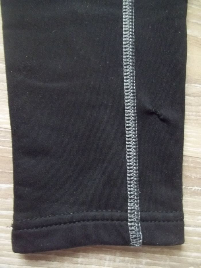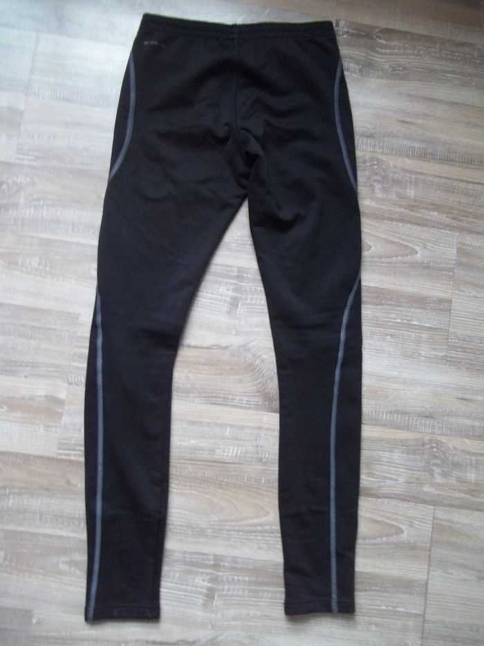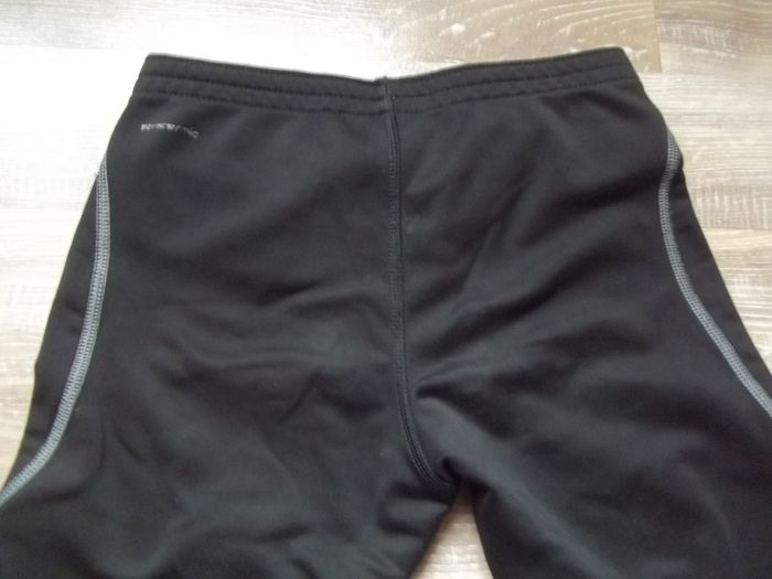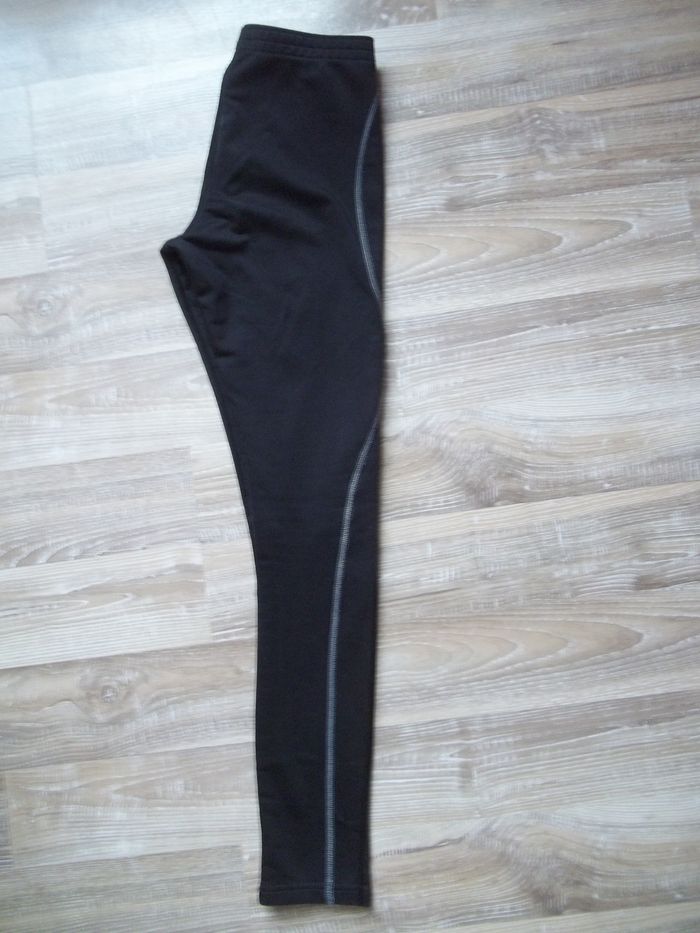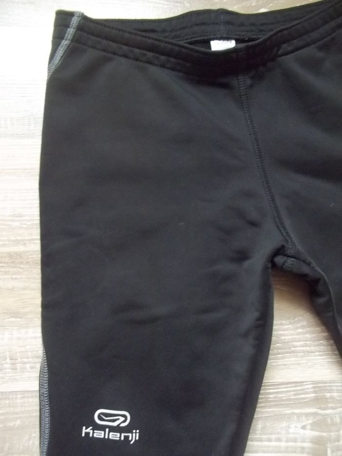 Caleçon de sport épais noir 90 % polyester 10 % élasthanne, élastique taille et cordon intérieur, petite poche intérieure à la taille (env 7 x 6 cm). Pas beaucoup porté mais petit accroc bas arrière jambe droite réparé. Entrejambe 64 cm, hauteur totale sur côté 82 cm, largeur taille 27 cm.