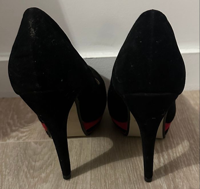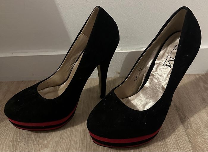 Vend haut talon taille 37. Ils sont de couleur noir avec du rouge sur la semelle. Les chaussures sont en matières velours. N’hésitez pas à faire un tour sur mon profile, d’autre chaussure ou vêtement y sont en vente.