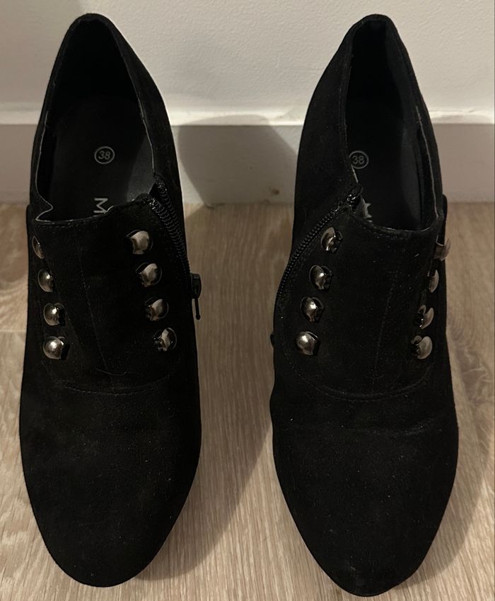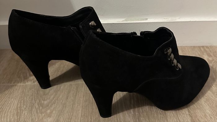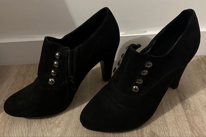 Vend bottines à talon taille 38 de couleur noir. Il y a une fermeture éclair sur la face intérieur de la bottine. N’hésitez pas à faire un tour sur mon profile, d’autre chaussure ou vêtement y sont en vente.