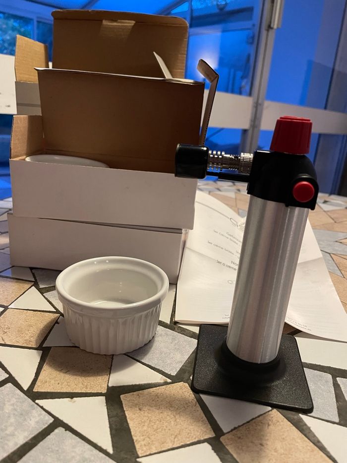 Set crème brûlée avec 4 ramequins et chalumeau (gaz non inclus) neuf, jamais servi.