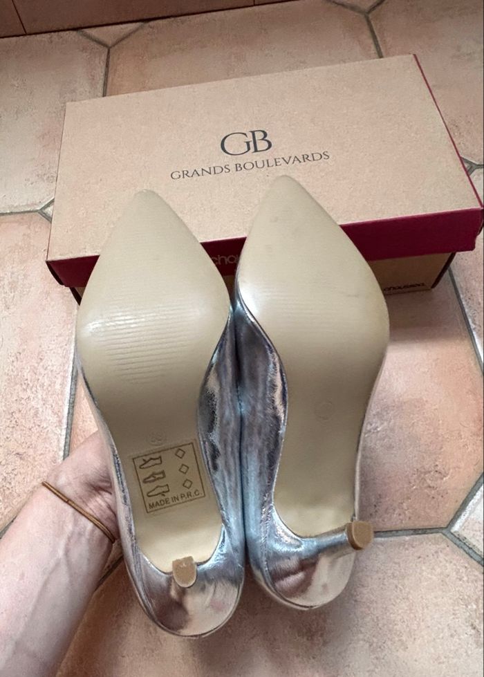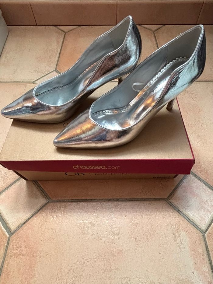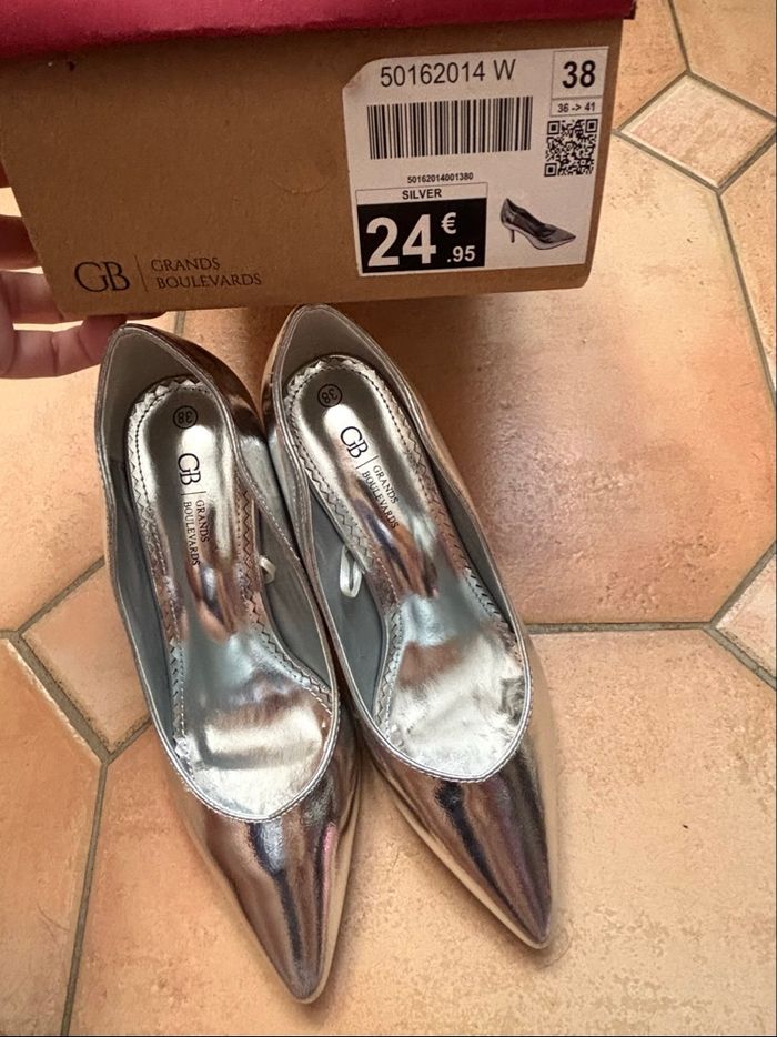Paires d’escarpins argenté jamais porté neuf, talons 8cm Prix d’achat 24.95 € Tous les escarpins sont à 5€, 2 paires achetées la troisième offerte ce qui revient à 10€ les 3 paires