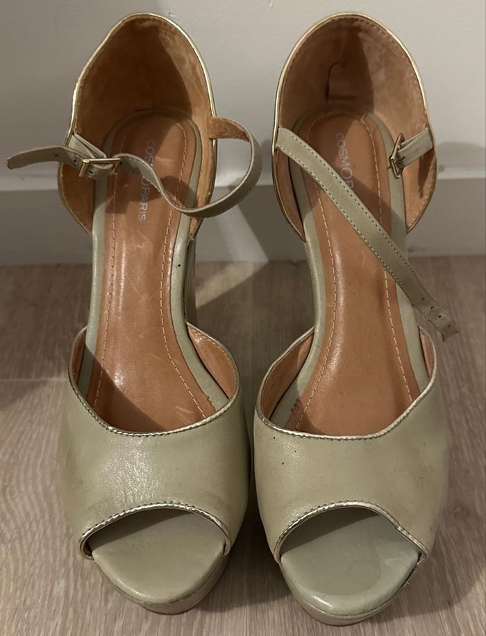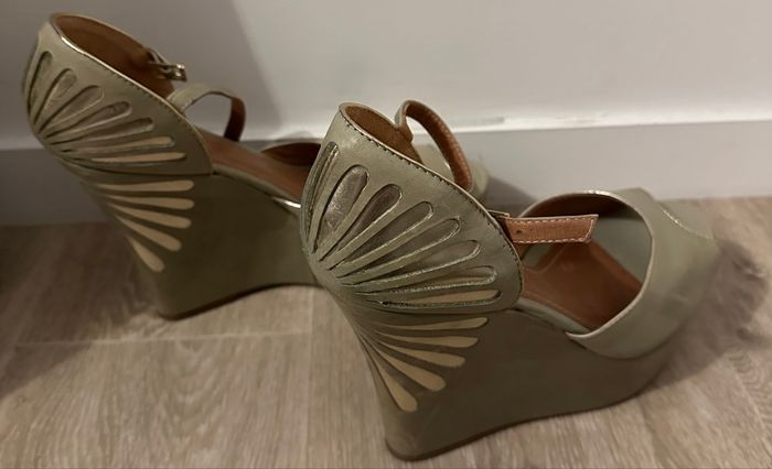 Vend chaussure à talon compensées taille 38 de couleur verte avec des motifs doré. Se ferme avec une lanière sur le devant. N’hésitez pas à faire un tour sur mon profile, d’autre chaussure ou vêtement y sont en vente.