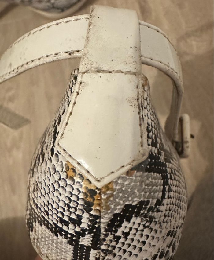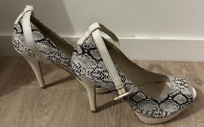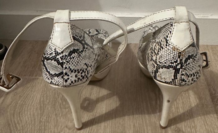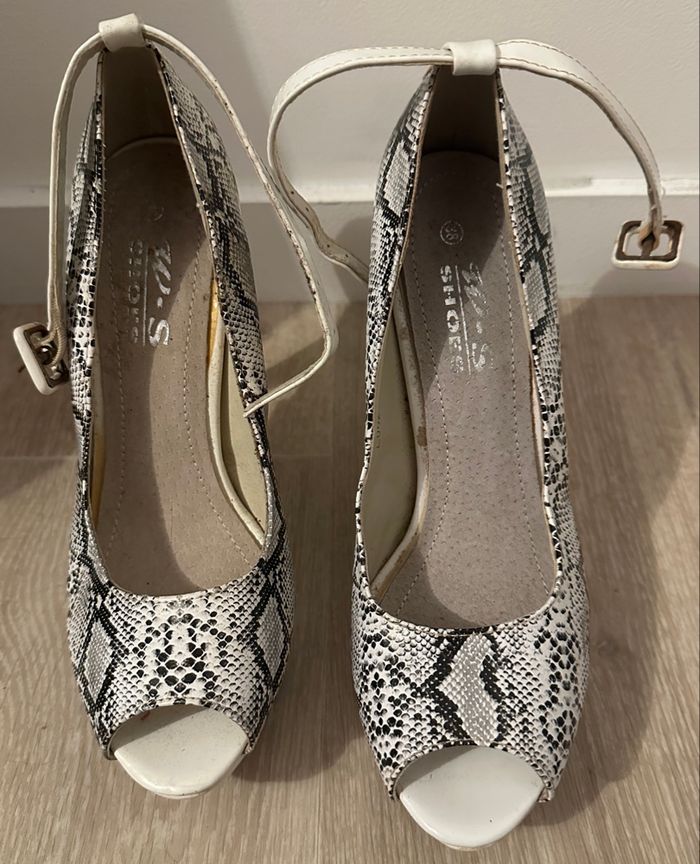 Vend chaussure à talon taille 38. Elles sont en motif python et ont quelque tache. Elles se ferme grâce a une lanière sur le devant. N’hésitez pas à faire un tour sur mon profile, d’autre chaussure ou vêtement y sont en vente.