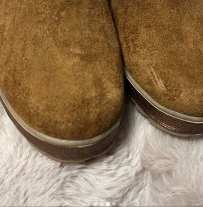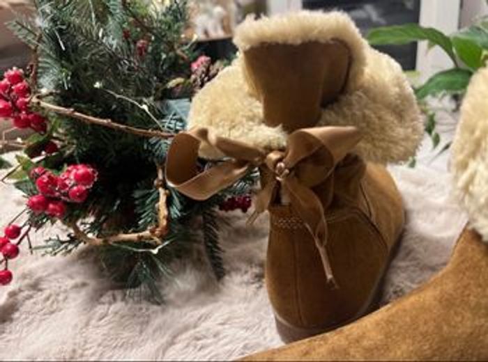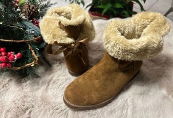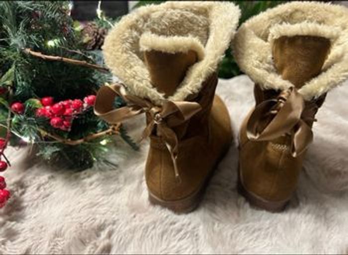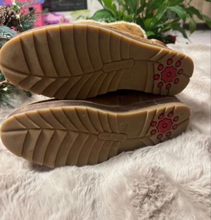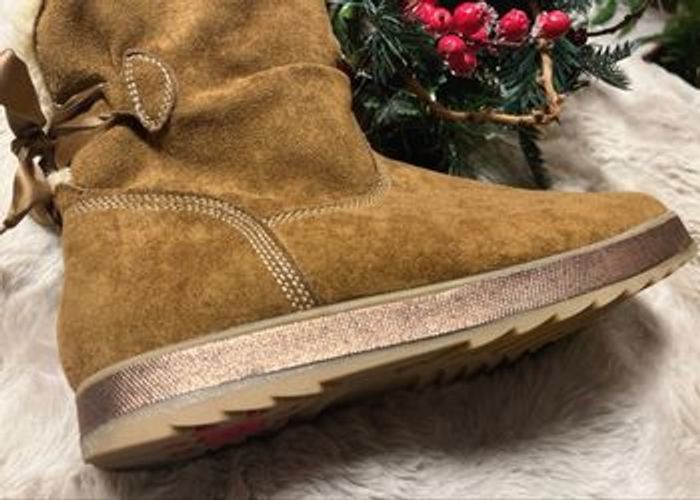 Bottines chaudes et élégantes avec ruban à l’arrière et bande brillante couleur bronze/cuivre tout autour de la semelle. Qualité Relife , confort et avec semelle absorbant les chocs . Très bon état hormis la petite marque à l’avant ( voir photo)