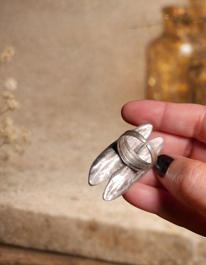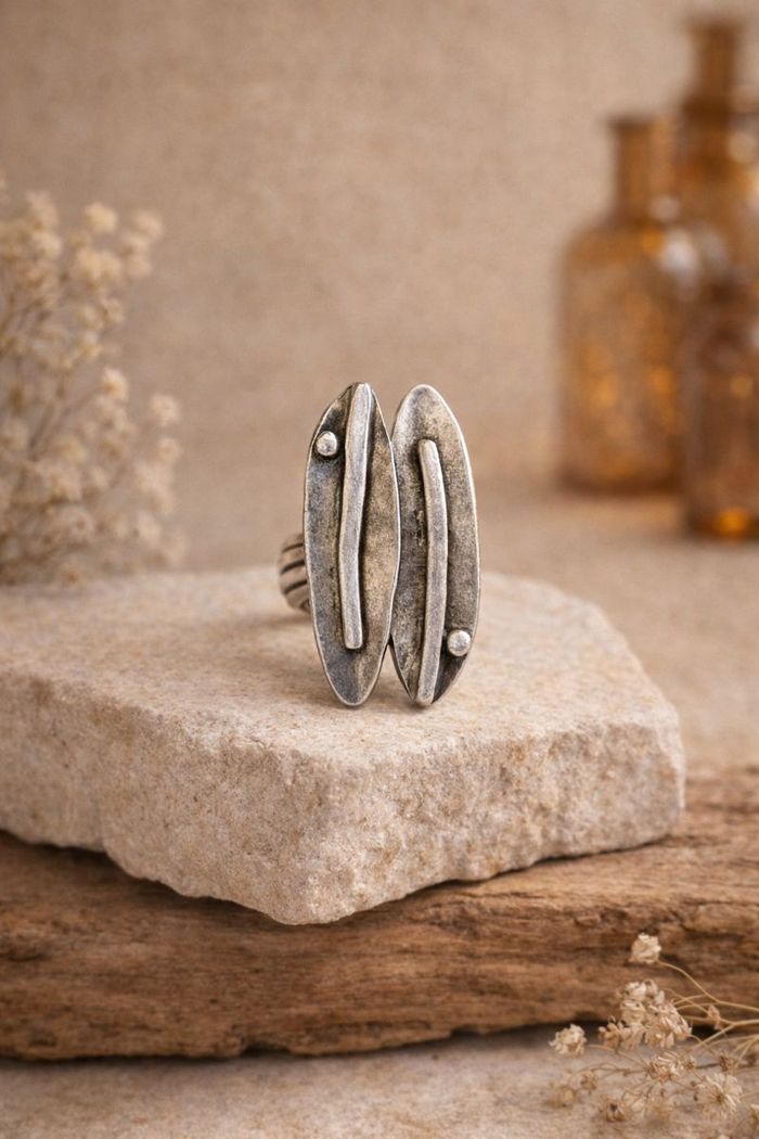 Bague de caractère au design graphique, composée de deux formes allongées en relief, avec une finition patinée d’inspiration artisanale. Une pièce originale et facile à porter. Détails : • Plaqué argent, aspect vieilli • Très bon état, jamais portée • Bague ajustable • Dimensions : env. 5 × 2,4 cm Envoi rapide et soigné via Beebs.