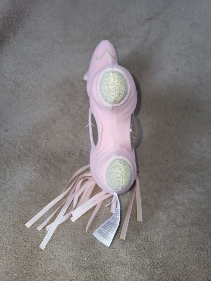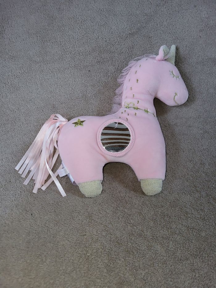Doudou Peluche licorne rose avec des motifs brodés dorés, crinière en tulle, queue en rubans roses Miroir et grelots Dimension environ 23 sur 22cm Très bon état, peu utilisé #virgy61joueteveil #virgy61puericulture