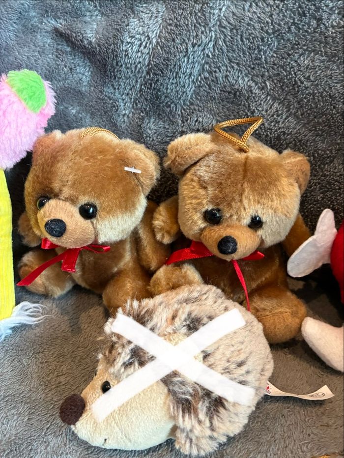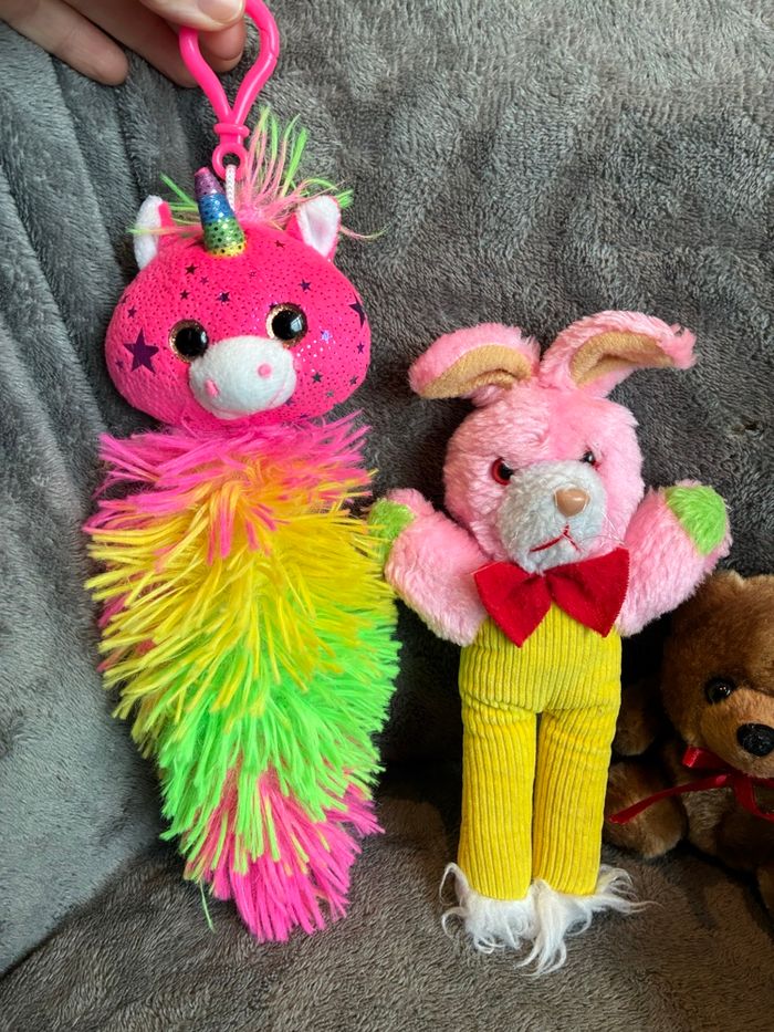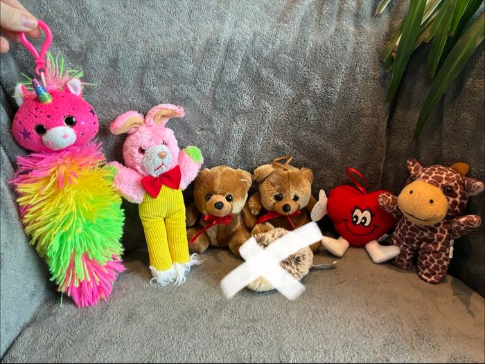 Lot de petites peluches Idéal pour une fête ou kermesse (d’autres lots dispo) 2 petits ours / 1 hérisson Spontex (vendue) / 1 cœur / 1 girafe / 1 lapin vintage (80’s) / 1 licorne toute douce avec queue et attachable (achetée à bagatelle) #stefetjuju51jeux maison non fumeurs bien d’autres choses dans mon dressing de nouveaux articles très régulièrement nombreux # dans mon profil pour faciliter vos recherches merci pour votre visite et belle journée ☺️ #peluche #lot