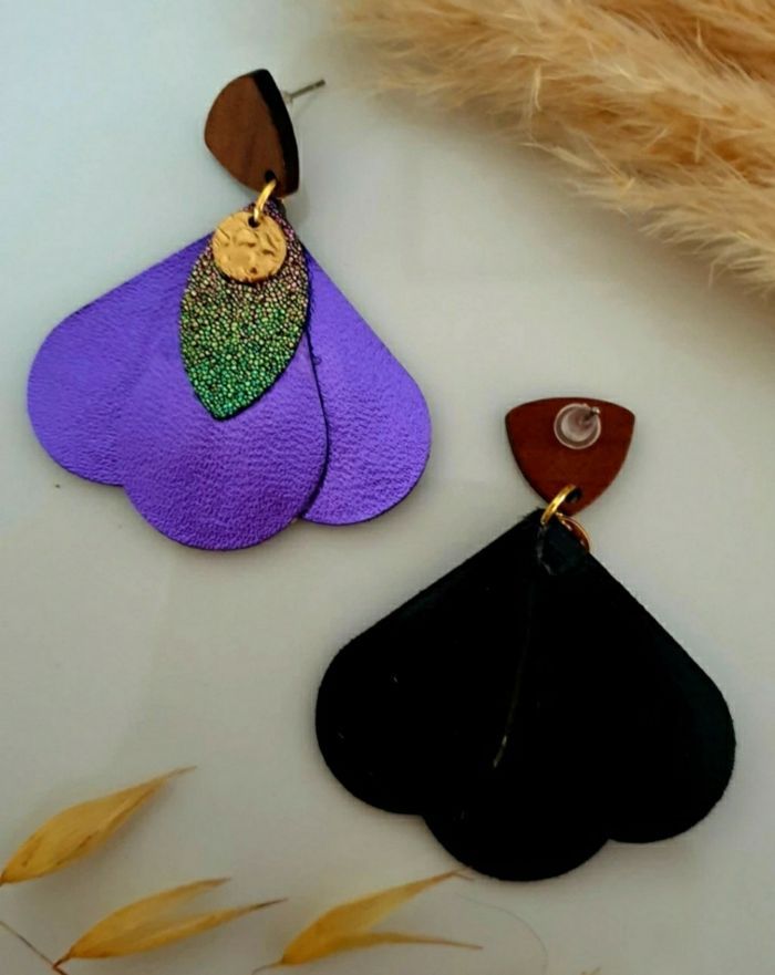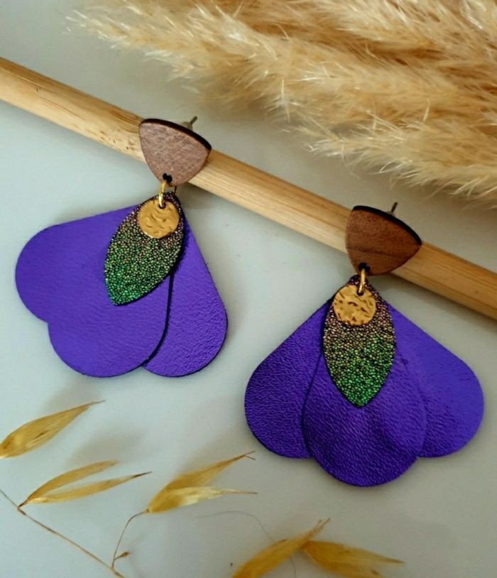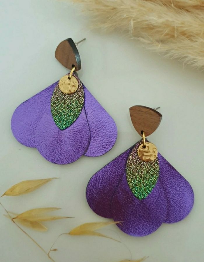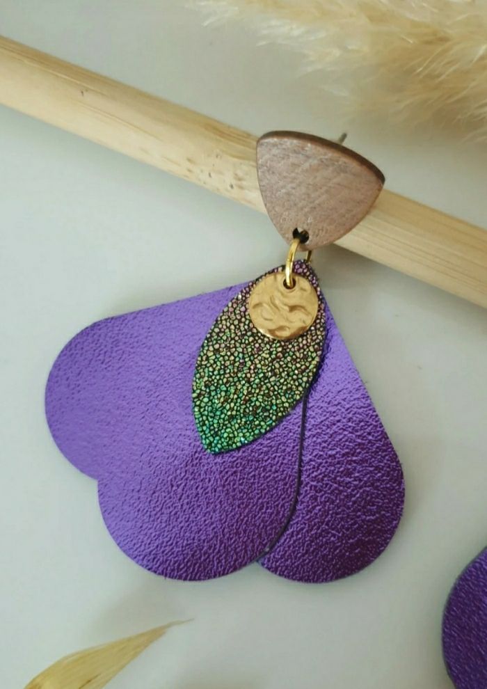 Boucles d'oreilles pendantes avec pampilles en cuir violet métalisé et similicuir pailleté montées sur des attaches en bois de noyer avec tige en acier inoxydable Longueur environ 5cm Bijou de création ✋