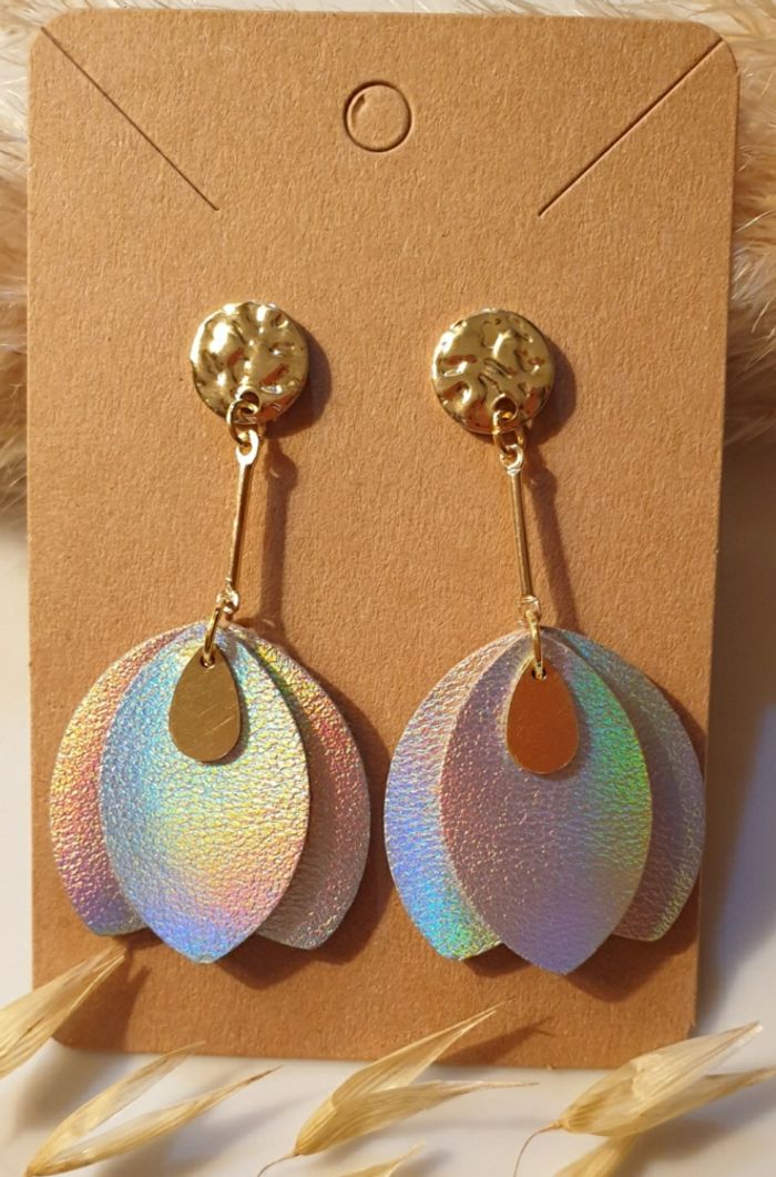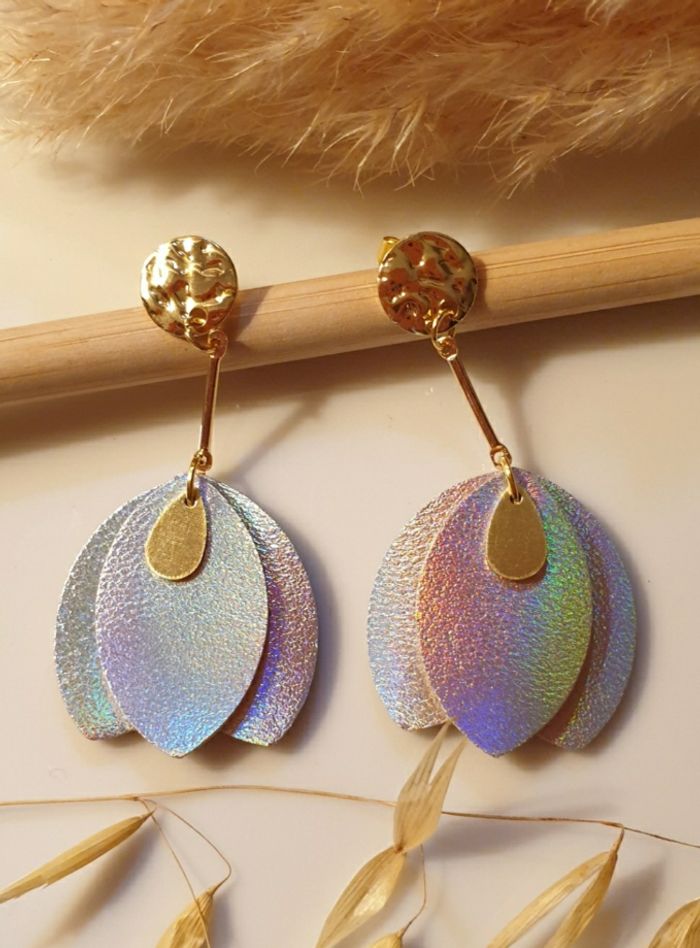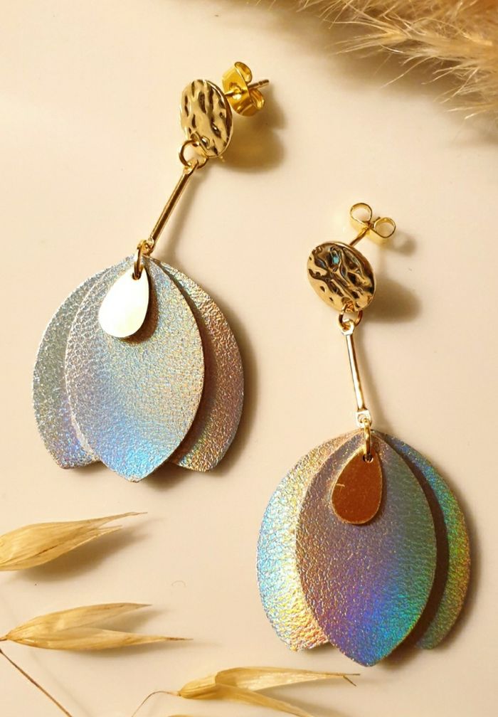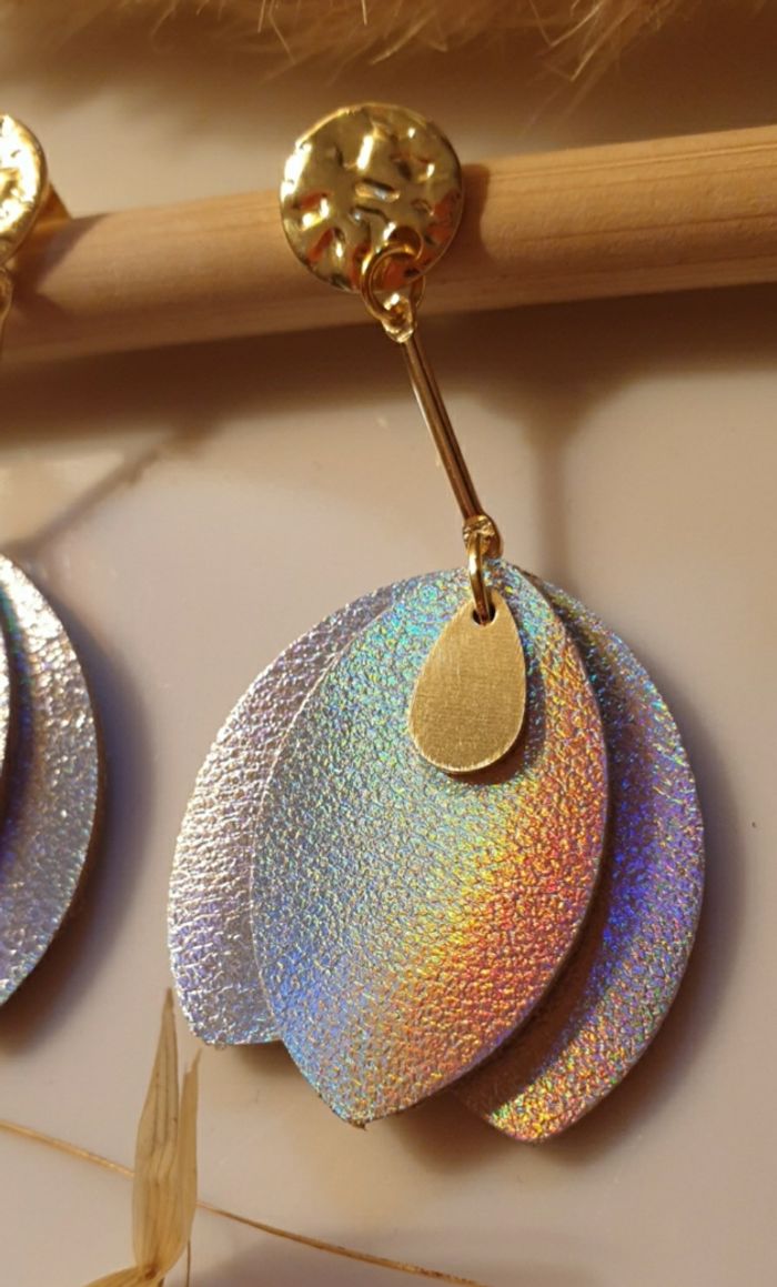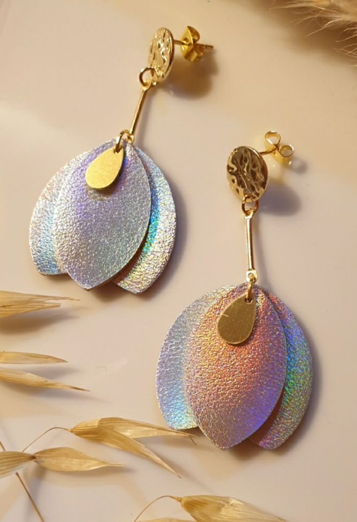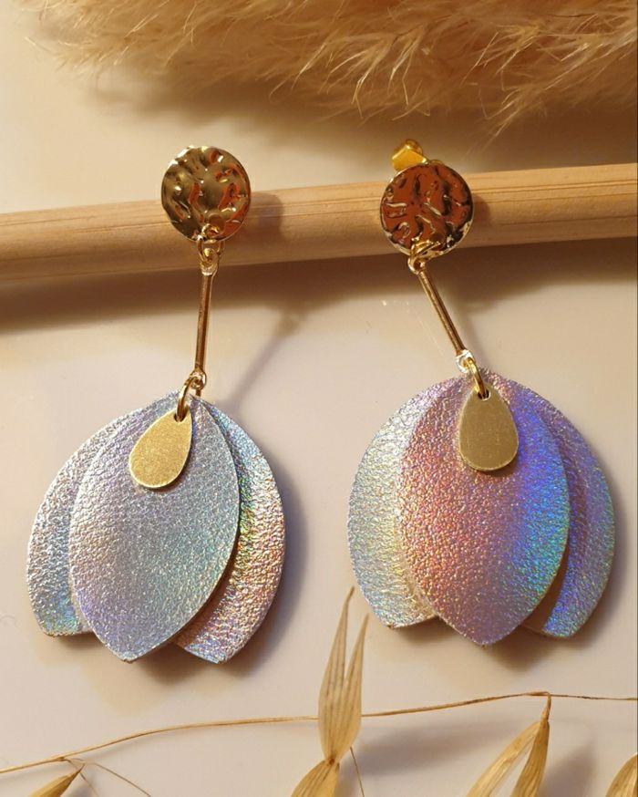 Boucles d'oreilles pendantes avec pétales de cuir argenté holographique Très légères et lumineuse faisant de magnifiques reflets arc-en-ciel dans la lumière 🌈 Bijou de création ✋