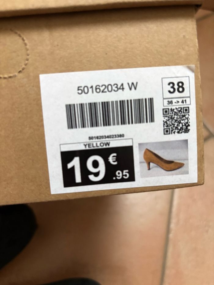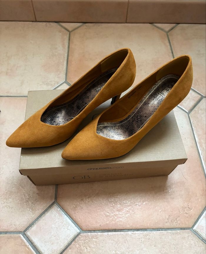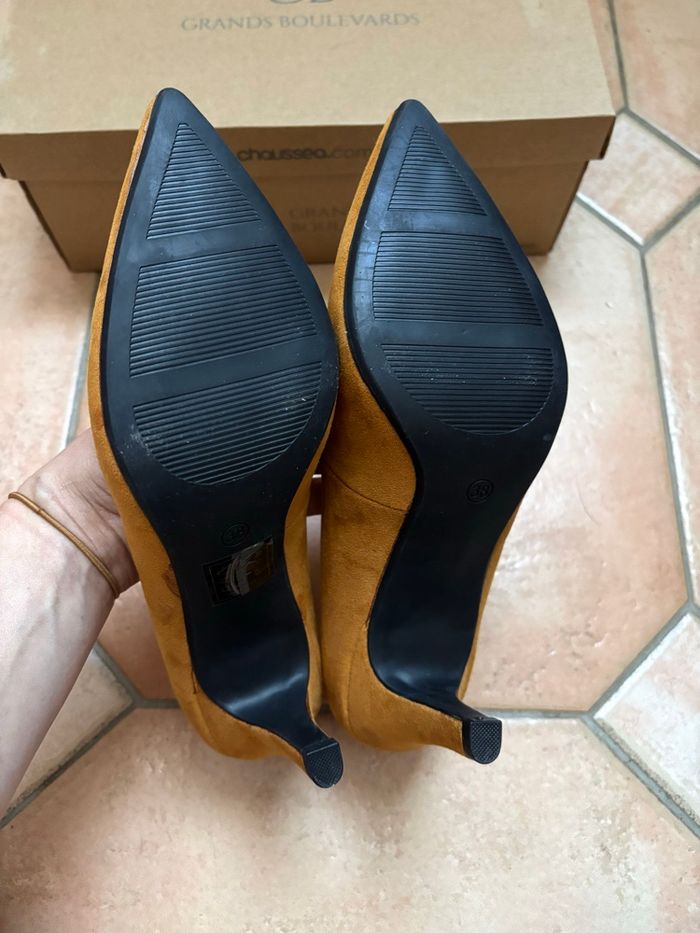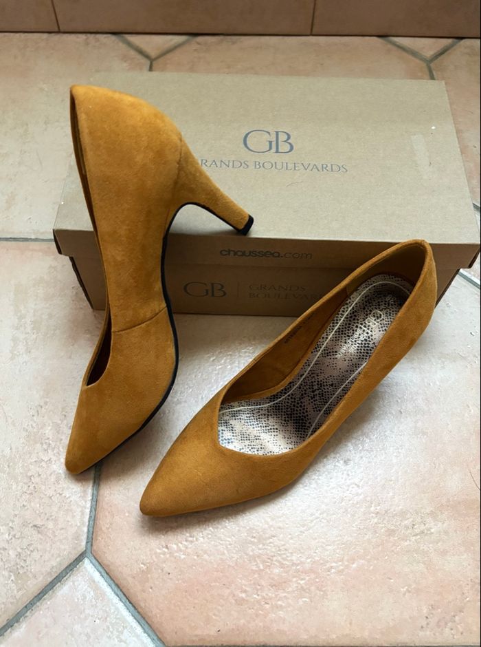 Paires d’escarpins jaune moutarde talons 7.5cm avec boîte d’origine. Prix d’achat 19.95€ Tous les escarpins sont à 5€, 2 paires achetées la troisième offerte ce qui revient à 10€ les 3 paires