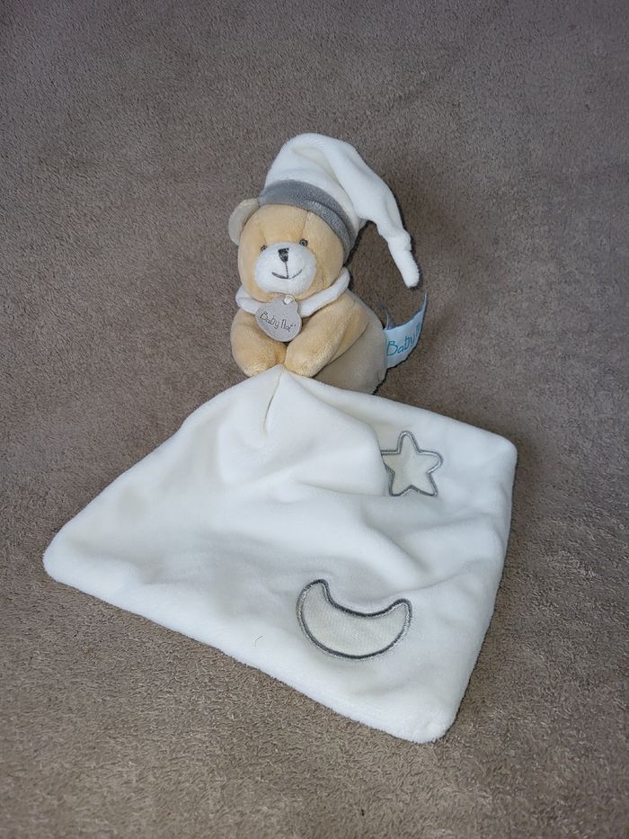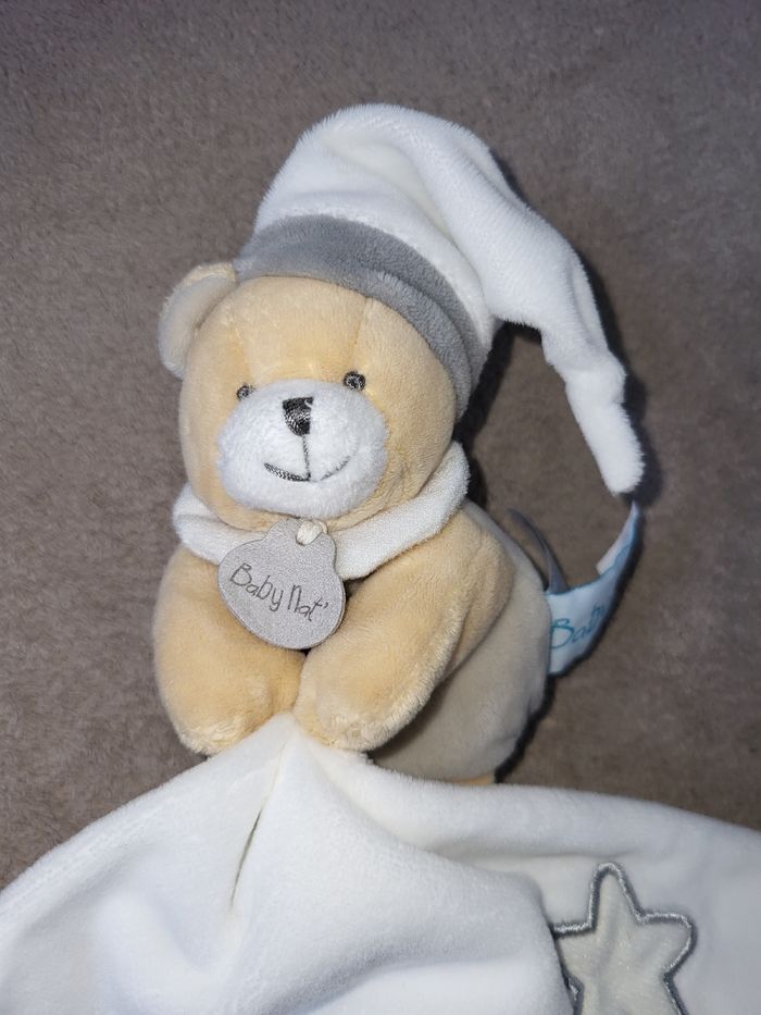Doudou plat ours tout doux Baby Nat' Tons taupe, marron, gris et blanc Mouchoir d'environ 19 sur 19 cm avec motifs lune et étoile lumineux dans la nuit Très bon état N'a pas été choisi comme LE doudou Quel bonheur ce compagnon rassurant pour Bébé avec ce doudou Ourson dont une étoile et un croissant de lune brillent dans la nuit. Il sera le compagnon idéal de bébé pour de doux câlins. #virgy61joueteveil #virgy61puericulture