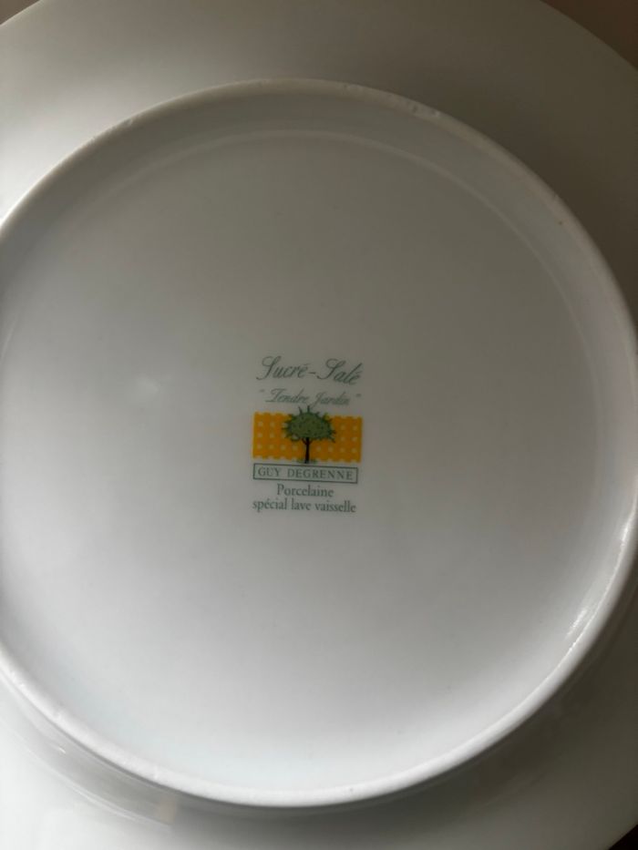 Très bel ensemble de 5 assiettes à dessert Marque : Guy Degrenne Collection Sucré Salé « tendre Jardin » modèle Prune En très bon état Diamètre 20 cm