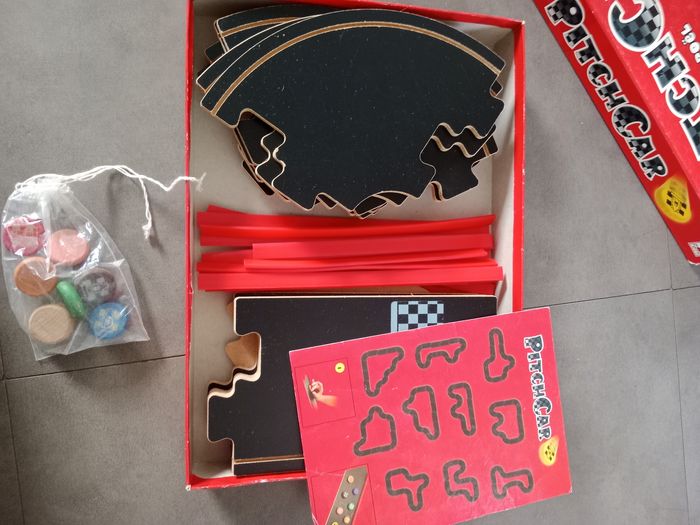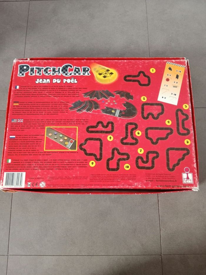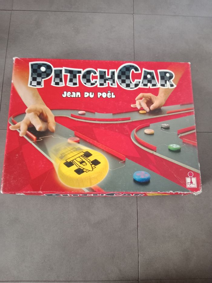 Jeu de pitchenette PitchCar de Jean du Poël. Boîte avec signes d'usure. Jeu complet avec quelques légers signes d'usure. Règle du jeu déchirée en bas à droite.