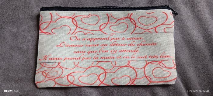 Pochette avec message d'amour "On n'apprend pas à aimer, L'amour vient au détour du chemin Sans que l'on s'y attende. Il nous prend par la main et on le suit très loin ..." Dimensions: 20 x 11 cm