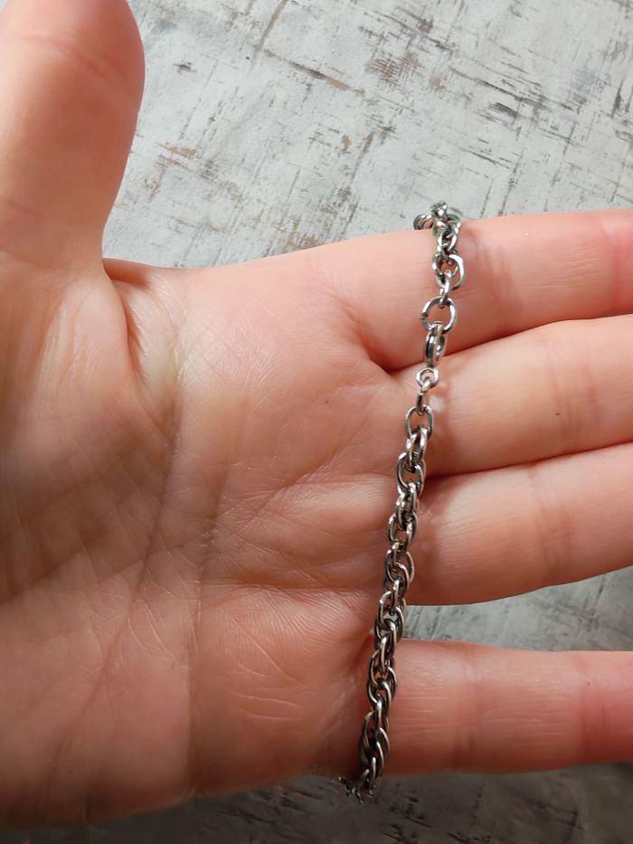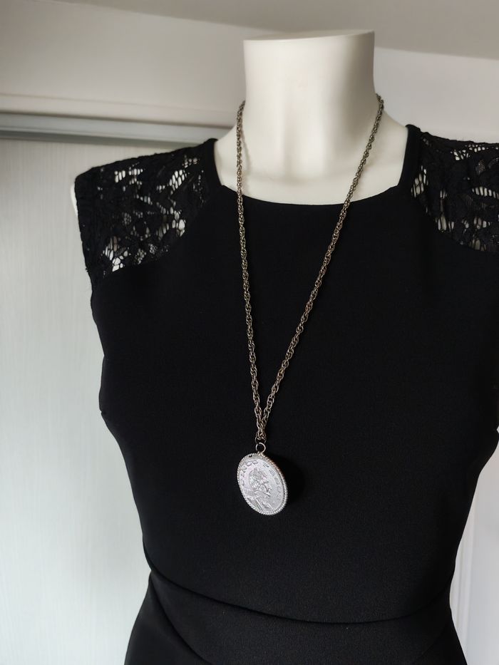 Sautoir chaîne à pendentif pièce de monnaie Vicente Guerrero du Mexique 1977 cinco pesos. Chaîne torsadée épaisse, de couleur argentée, je pense en acier inoxydable, en très bon état, la pièce-médaille est aussi en très bon état. Dimensions : Longueur: 69 cm Epaisseur chaîne : 4 mm Damètre pièce : 3,5 cm Poids : 37g