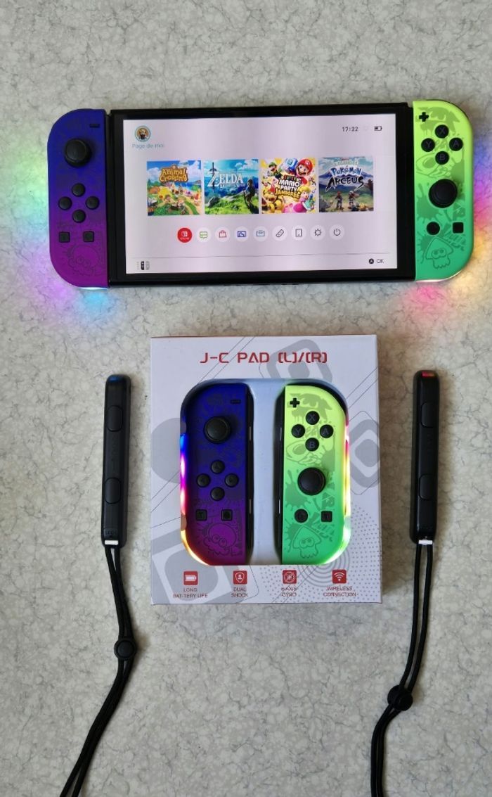 Manettes joycons non officielles compatibles console Nintendo switch v1 v2 et oled. Neuves Design splatoon leds avec dragonnes Très bonne qualité Envoi en 48h Fonctionnent en bluetooth et sur console Gyroscope Bonne autonomie de la batterie