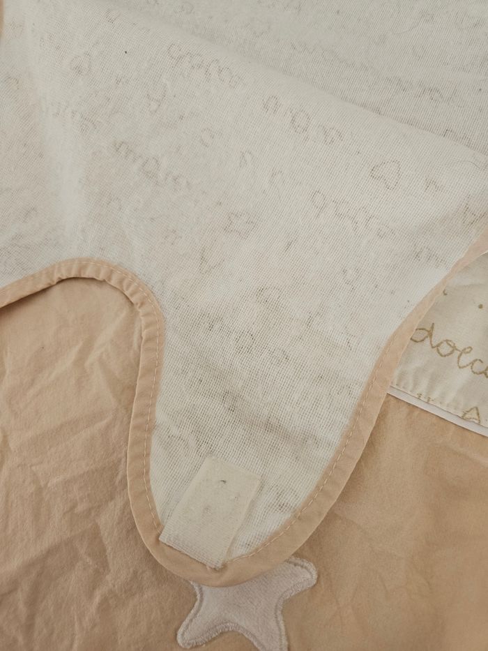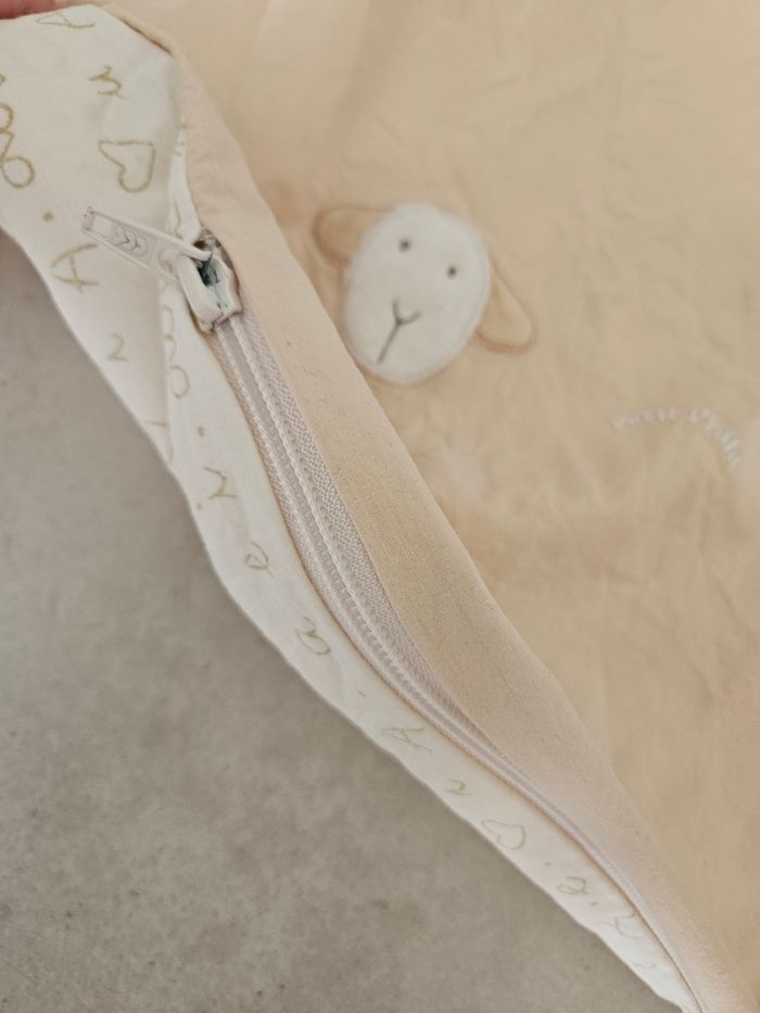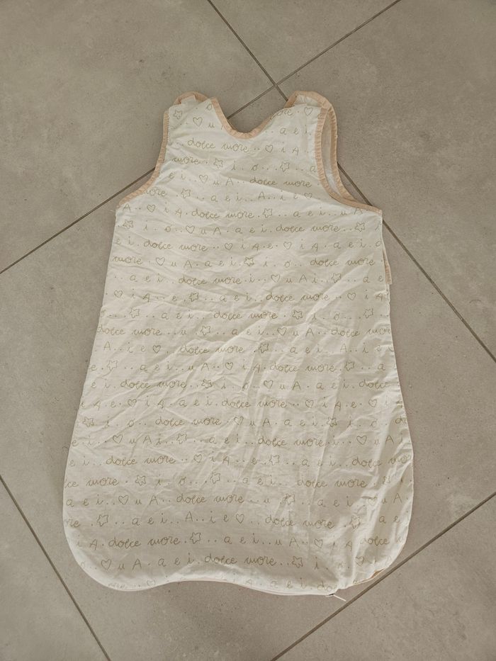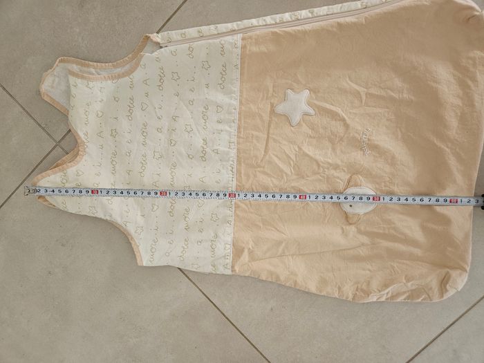 Turbulette fine en coton coloris beige avec décor petit mouton étoile petit prala. Se ferme avec un zip en bas et de scratch au niveau des épaules. Idéal pour bébé l'été, gigoteuse fine. HAUTEUR 63CM.