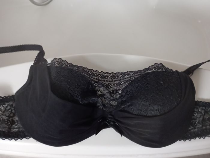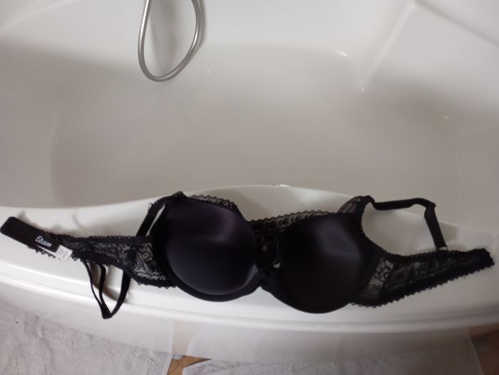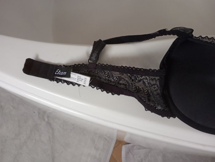 très joli et original soutien gorge noir avec armatures et bonnets rembourés marque ETAM taille 95 C 88 % polyamide et 12 % élasthane très bon état pour plus de renseignements, n'hésitez pas à me faire un message j'étudierai tout proposition que vous me feriez