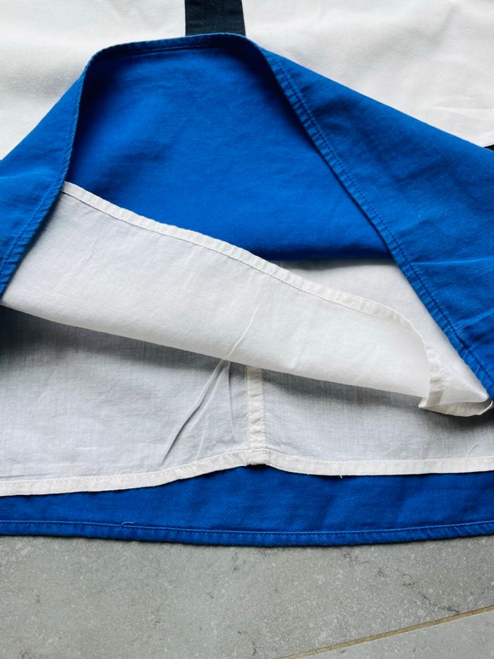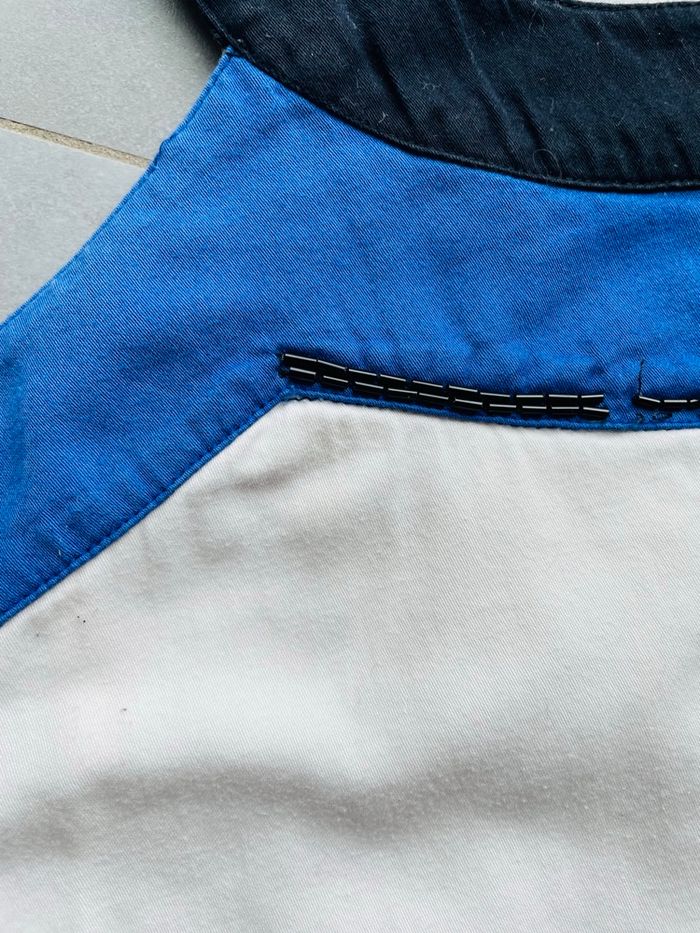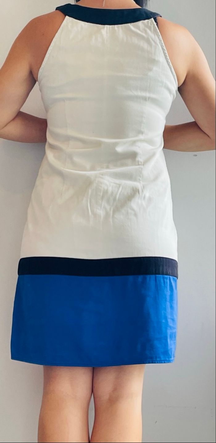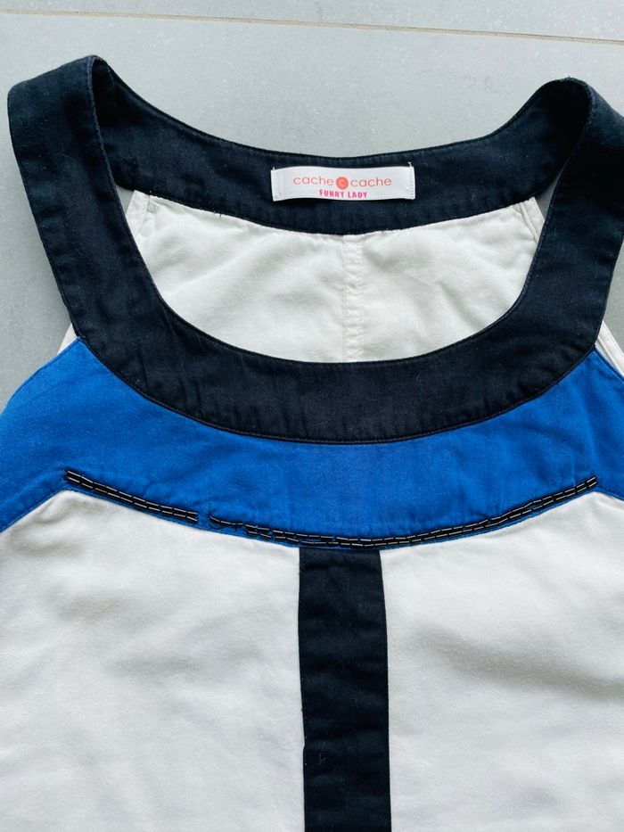 Jolie robe Blanche bleu et noire Chic et stylée Peut être mise pour une cérémonie (mariage baptême) Doublure Joli col petit défaut sur le col avec les strass (voir photo) et une légère trace en haut également mais très peu visible (voir photo également) Sans étiquette de taille mais convient idéalement à un 36 voire petit 38 #stefetjuju51femme3638 maison non fumeurs bien d’autres choses dans mon dressing de nouveaux articles très régulièrement nombreux # dans mon profil pour faciliter vos recherches merci pour votre visite et belle journée ☺️ #robe #été #chic #ceremonie #bapteme #mariage