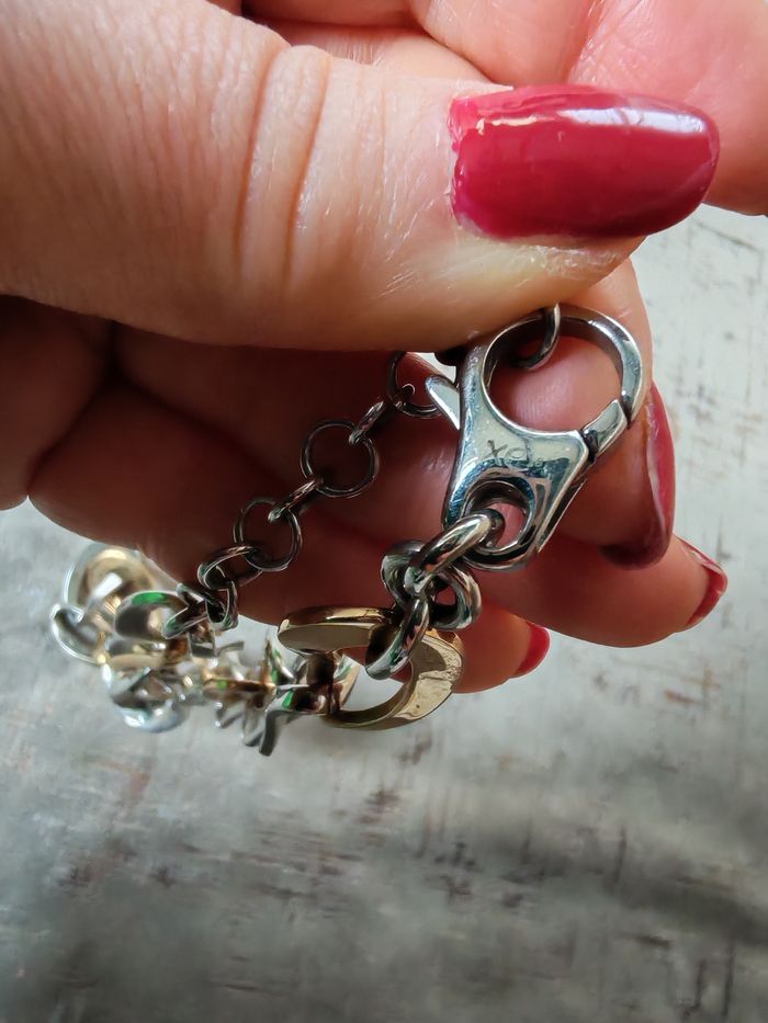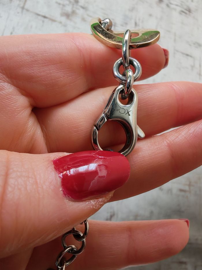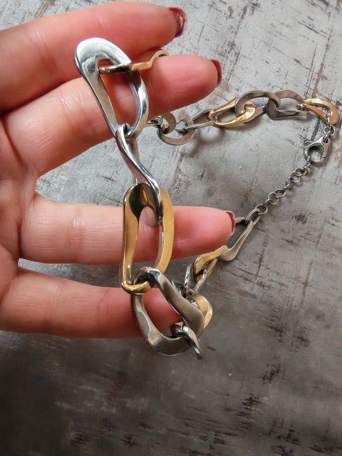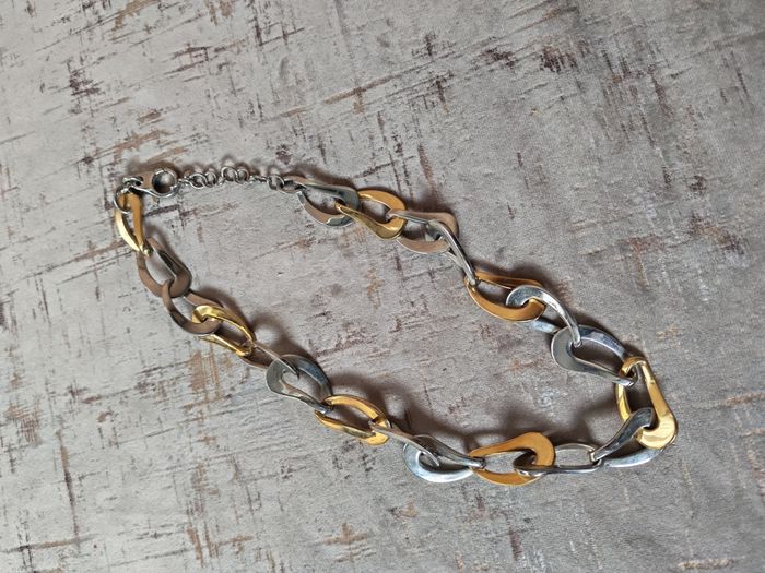Chaîne gros maillons tendance ras de cou argenté et doré, en acier inoxydabe, porte la marque XO sur le fermoir, en très bon état. Beau bijou de qualité, avec la rallonge. Dimensions : Longueur avec la rallonge : 48 cm Epaisseur : 18 mm Poids : 90g
