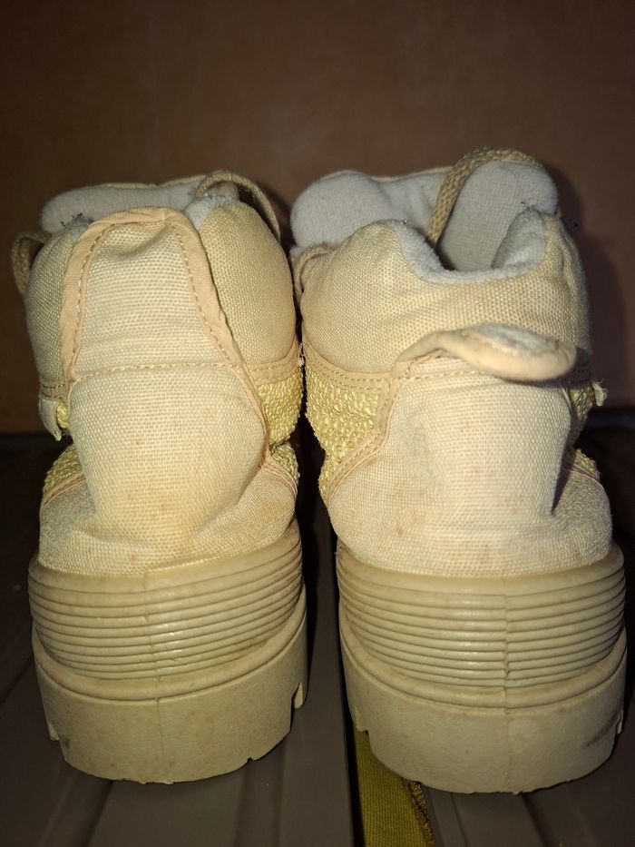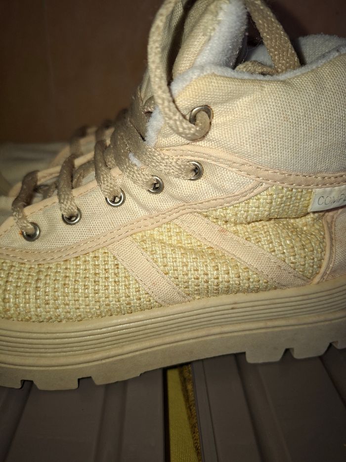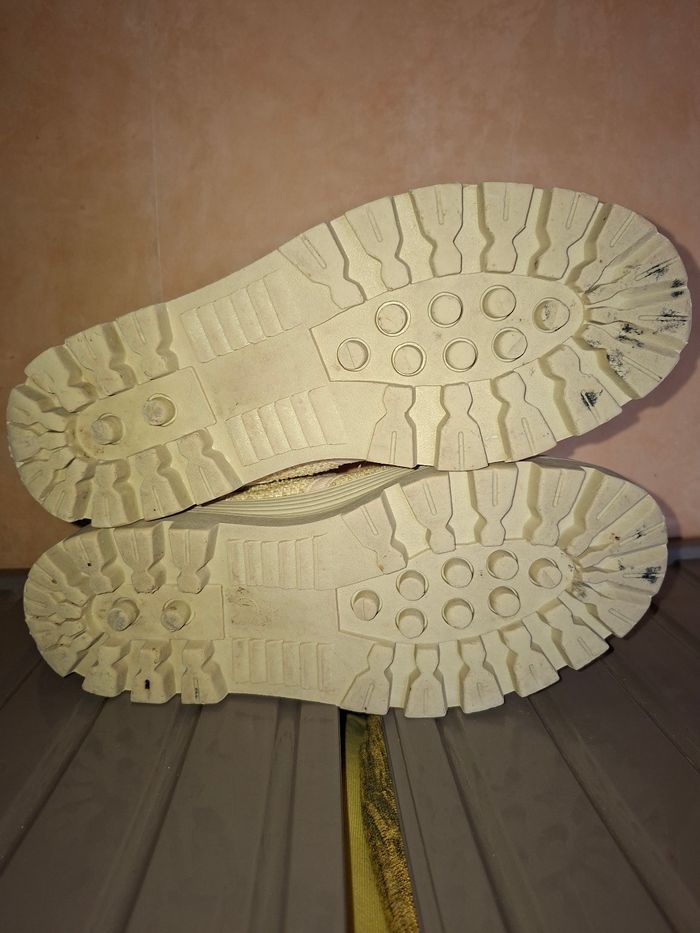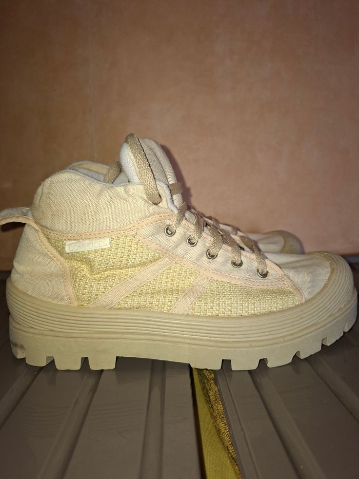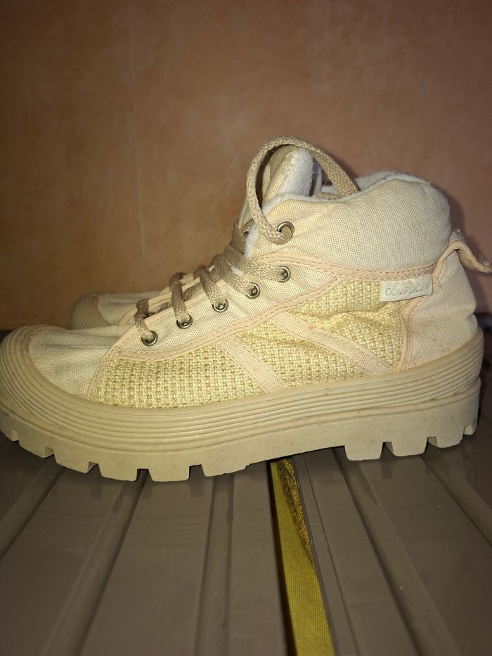 ​Je vends ces baskets hautes de la marque Complices, un modèle original qui mélange style urbain et esprit baroudeur. Elles sont super légères à porter malgré leur look robuste ! ​Marque : Complices. ​Pointure : 39. ​Design : Tige haute en toile beige avec des empiècements texturés sur les côtés. ​Semelle : Semelle plateforme crantée (très tendance) en parfait état. ​Couleur : Beige sable / Crème, facile à assortir. ​État : Portées mais bien entretenues. Les semelles sont quasi neuves. ​Parfaites avec un jean ou un short pour un look décontracté.