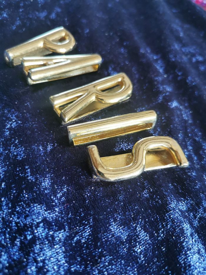 Paris décoration de ceinture, lettres décoratives vintage en métal doré, certaines lettres sont gravées de lettre "T" au dos. Les boucles sont en très bon état général pour une objet vintage, je pense des années 1980/1990, ont quelques marques. Belle objet de collection ou d'utilisation. Dmensions : Logueur : 4,5 cm Largeur : 15-18 mm Eaisseur : 1 cm Espace pour les enfiler dans la ceinture : 5-6 mm Poids : 62g