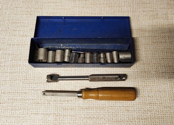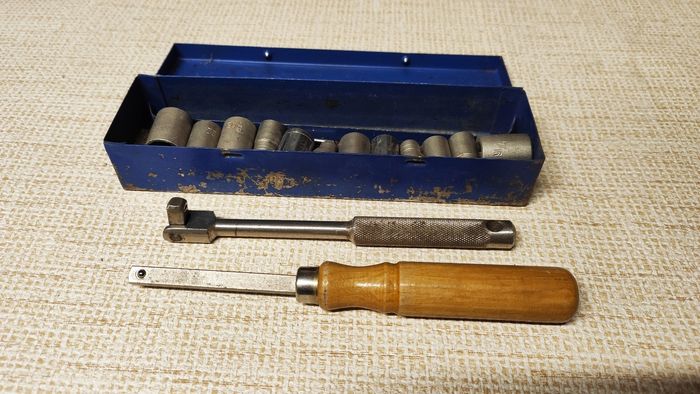 Boite à outils avec cliquets et tourne vis, avec leur embouts. Ancien et solide