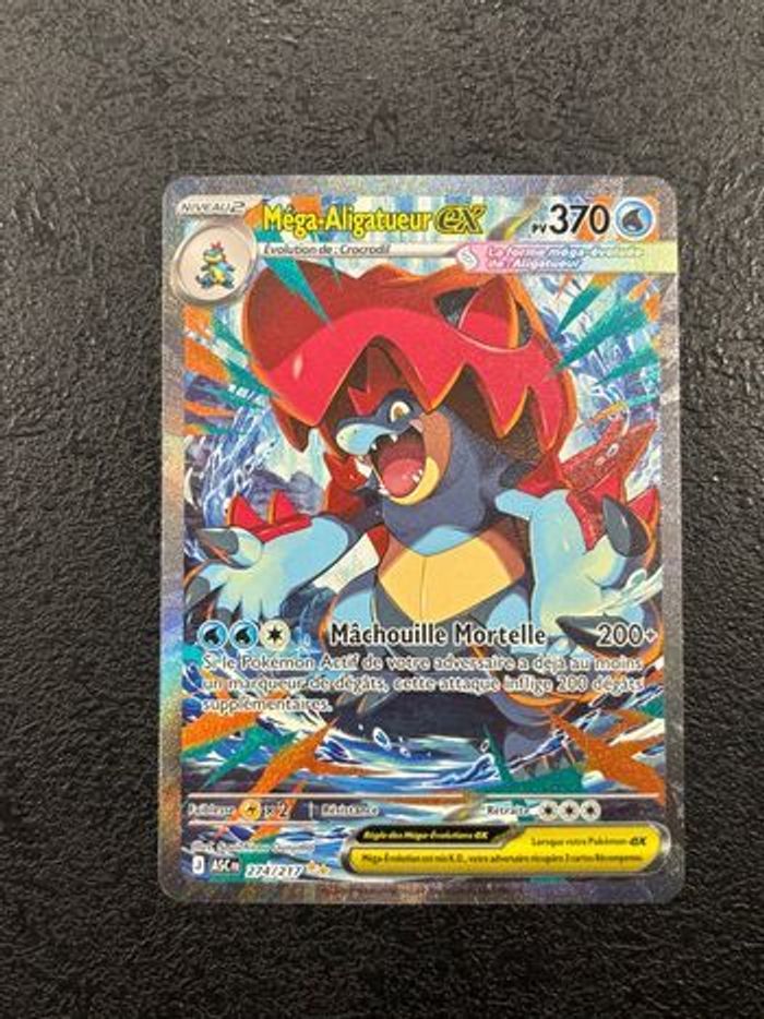 • Méga-Aligatueur ex 274/217 • Héros transcendants ME2.5 • En français • En excellent état (voir photos) • Mise sous sleeve à la sortie du booster • Envoi rapide et bien protégé