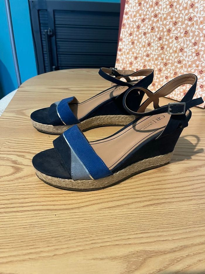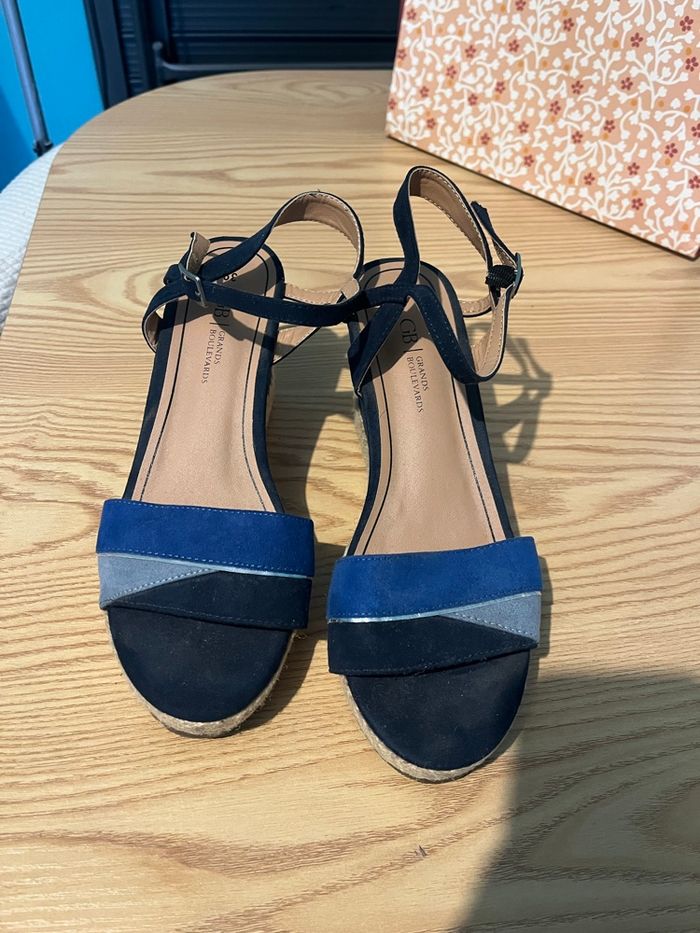 Espadrilles compensées Couleur paille sur le dessous, marine, bleu clair et bleu électrique Les couleurs bleues sont d’une texture assez douce (presque daim) Comme neuf À attacher à la cheville N’hésitez pas à faire des lots 😊