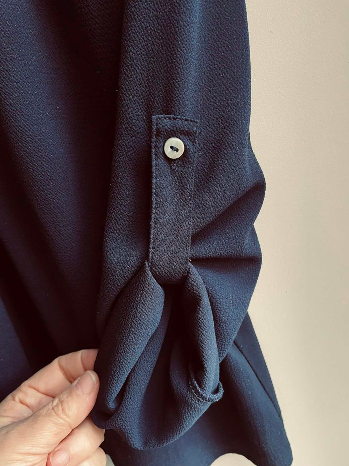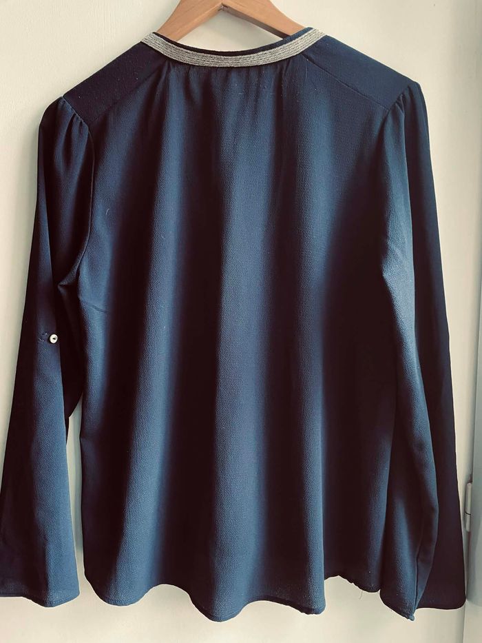 Blouse T M/L Bleu uni ,col bordé de strass argenté Marque "Peace n' Love" En polyester Manches retroussables Très bon état Envoie sous 48 h