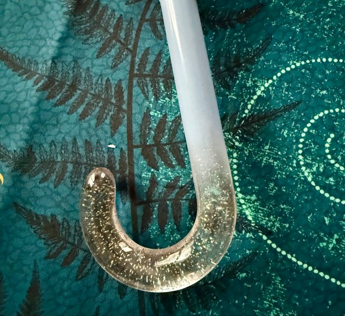 Peu servis Imprimé Fée Clochette et petites étoiles dorées (photo 2) Forme cloche en plastique transparent Bordure en tissu bleu Bout de protection en plastique et arrondi Bout des baleines protégé (forme arrondis) Poignée pailletée (photo 3) Lien avec pression pour le fermer