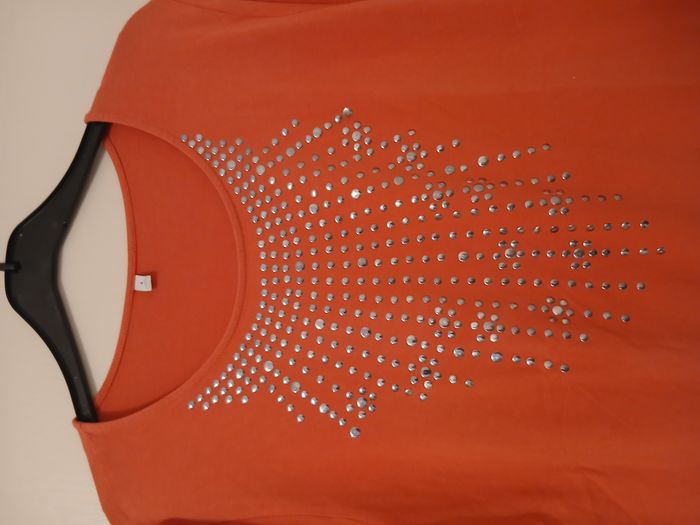 Tee shirt couleur corail et argenté, en viscose et élasthane. 44 cm de largeur des épaules 52 cm de largeur des aisselles 65 cm de longueur