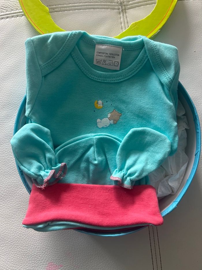 Boîte cadeau contenant : body gants et bonnet Idéal cadeau de naissance