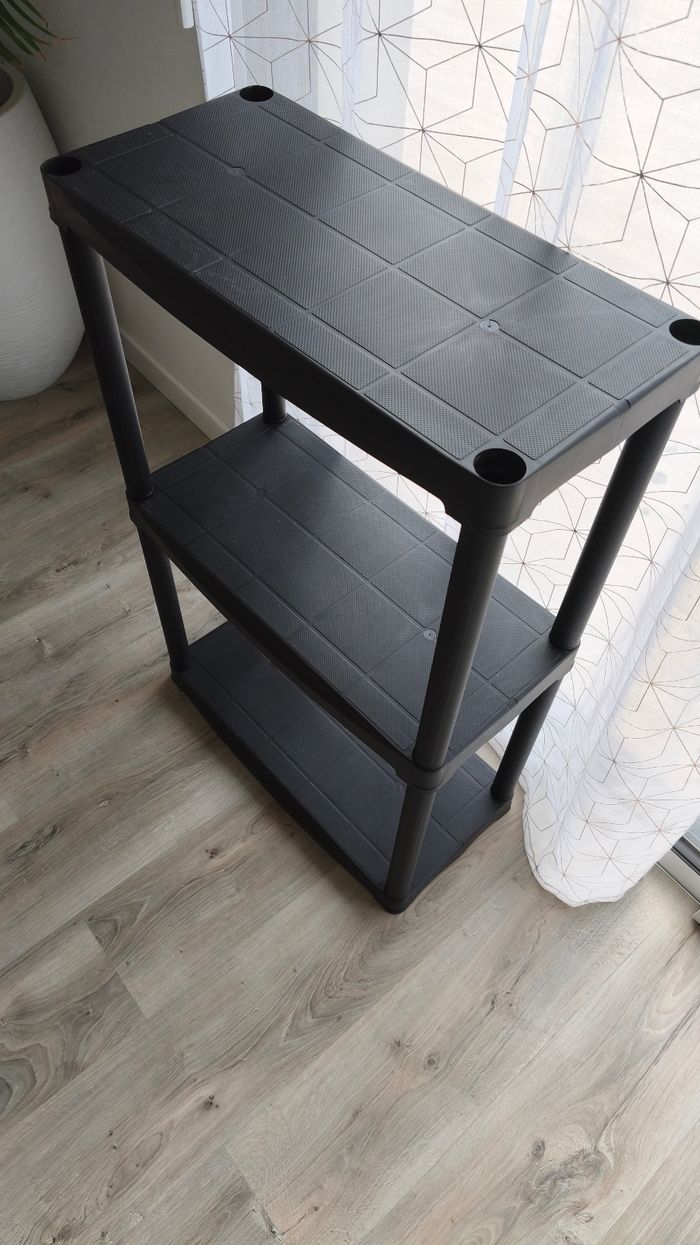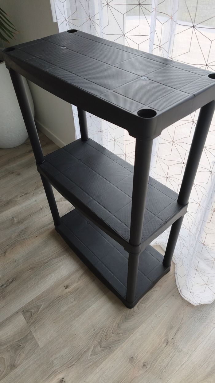 Étagères 3 etages noir en plastique dur. 20kg / étagères. État : présence de traces utilisations Reste en très bon état. Dimensions : Largeur : 60 cm Hauteur : 90 cm Profondeur : 30 cm #adou49accessoire