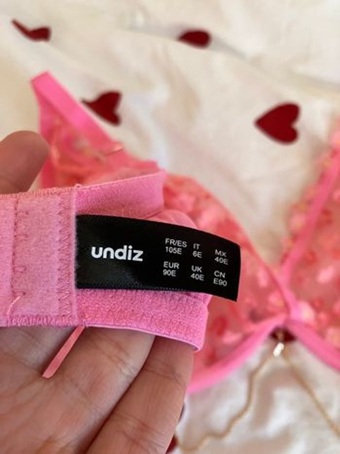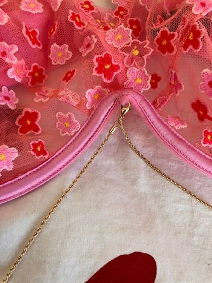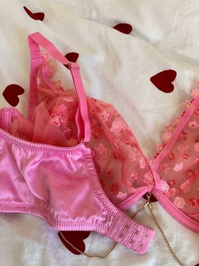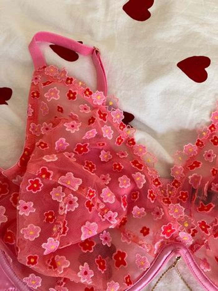 Soutien gorge fleurs avec armature de chez undiz Neuf, jamais porté. Il possède une petite chaîne décorative sur le bas qui peut être enlevée si vous le souhaitez ! Taille : 105 E Matière : polyamide, satin, polyester et elastane