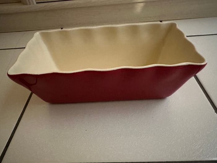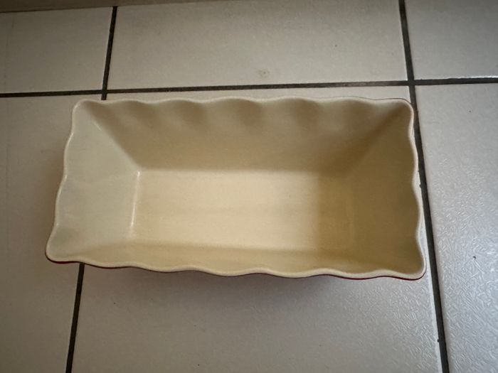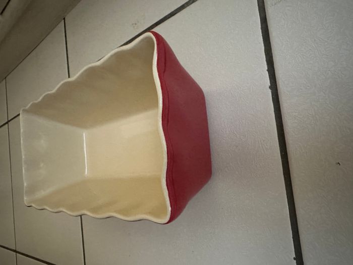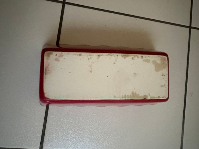 Plat à cake en céramique. en très bon état dimensions : Hauteur: 9,5 cm Longueur: 25 cm en haut / 13cm en bas Largeur: 8 cm
