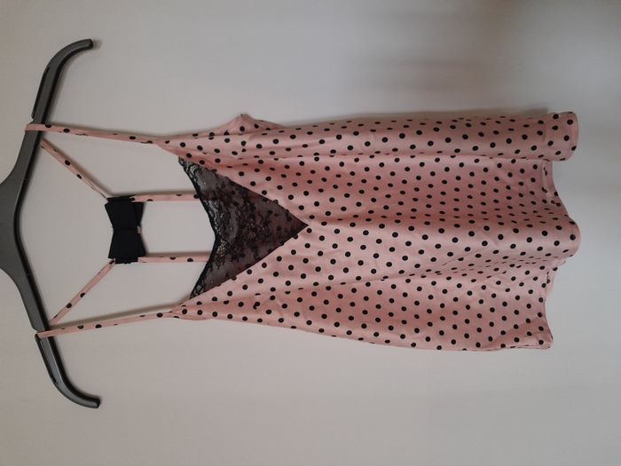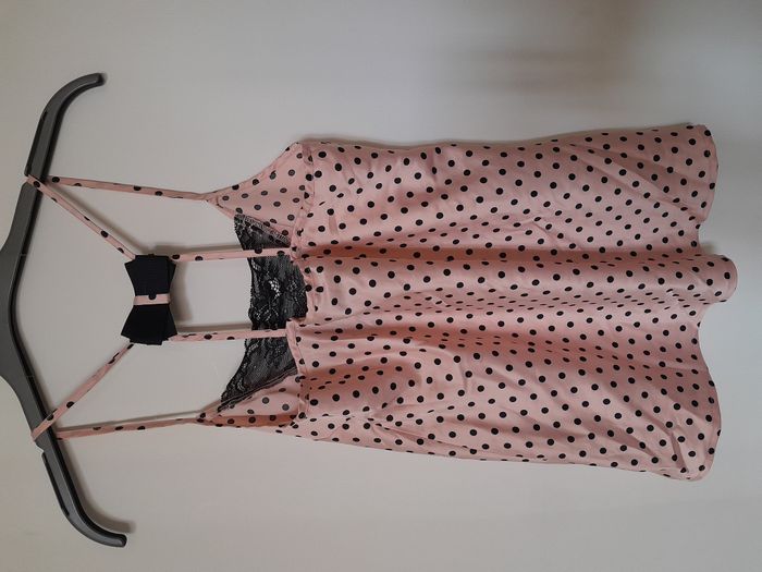 Ensemble pyjama, haut + short, à poids, satiné, Découpe dentelle devant + nœud au dos, nœud sur le short devant, élastique à la taille Longueur : 36cm pour le haut, 30cm pour le short Aiss / Aiss : 38cm pour le haut, Taille en cm 37 pour le bas Matière : 100 % Polyester Marque : Undiz
