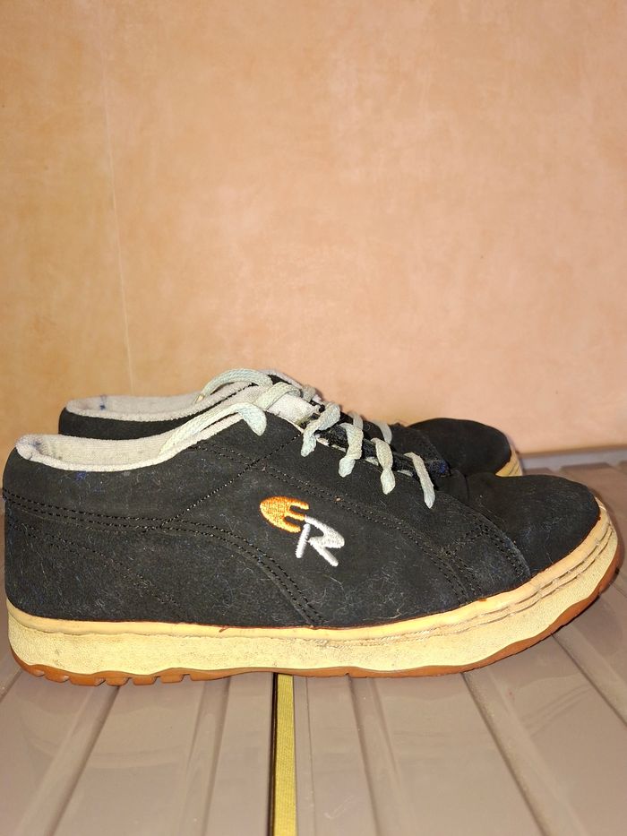 Vends paire de baskets au look vintage / skate, coloris noir avec détails brodés. ​Taille : 38/39 (idéal pour pied intermédiaire). ​Style : Semelle bicolore (crème et gomme) très robuste. ​Confort : Modèle bien rembourré au niveau du talon et de la cheville. ​État : L'article a été porté (voir photos pour l'usure naturelle). Les chaussures sont encore solides et parfaites pour un look décontracté ou pour servir de chaussures de rechange.