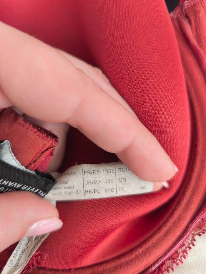 Soutien gorge Etam FR 100E La Forme : Il s'agit d'un soutien-gorge n°4 : Le Plunge (ou ampliforme plongeant). C'est une coupe classique chez Etam qui offre un décolleté en V tout en restant très confortable pour le quotidien. La Matière : Les bonnets sont en microfibre lisse "soft touch", conçus pour être invisibles sous les vêtements. Les Détails : On remarque une bande de dentelle florale délicate qui souligne le bas des bonnets et se prolonge sur les côtés (l'entre-sein et le dos). Un petit nœud satiné est présent à l'entre-sein. Le Coloris : Une teinte Terracotta ou Brique Armatures et coques fines Détails dentelle Même modèle et même taille en Couleur violine et rose pâle disponibles dans mon dressing + D'articles de cette taille dans mon dressing classé par taille dans à propos Maison non fumeur et sans animaux Envoi possible le jour même avec mondial Relay ou Chronopost ou remise en main propre sur Saleilles #ldura42 #ldura44 #lduralingerie