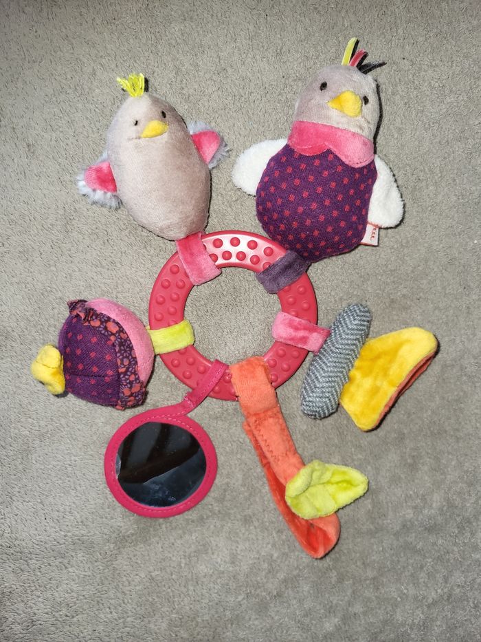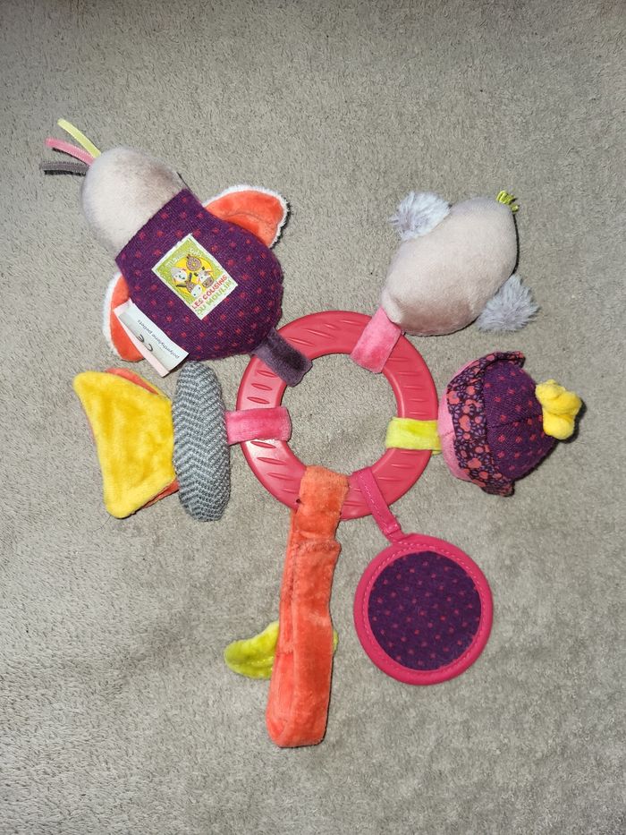 Anneau-hochet poule - Les cousins du moulin Anneau d'activité à suspendre pour bébé de la marque Moulin Roty S'accroche facilement grâce avec le scratch à la poussette, au cosy, au barreaux du lit... Ou bébé peut jouer avec même sans I' ac- crocher. Le jouet fait des petits sons de grelot, papier crissant, pouêt pouêt. Facile à attraper Lavable en machine à 30° Dimension de l'anneau environ 10cm Avec peluches environ 26cm Colorés, vitaminés, souriants et vraiment amusants, voici les Cousins du Moulin ! Mme Pivoine est une maman poule tout à fait charmante. Voici un joli anneau hochet pour éveiller tous les sens de bébé. Il est coloré pour éveiller son regard. Il dispose de différentes activités pour développer le toucher et l’ouïe. En effet, autour de l'anneau (qui peut servir d'anneau de dentition) se trouve : - une petite fleur qui vibre - un poussin qui fait le bruit d'un hochet quand on le secoue - une poule qui fait "pouët-pouët" quand on appuie dessus - un joli miroir pour se regarder - des ailes papillons qui font le bruit du papier crissant (scritch-scritch) quand on les touchent - un accroche tétine en velours Un anneau hochet complet qui amusera beaucoup bébé.         #virgy61joueteveil #virgy61puericulture