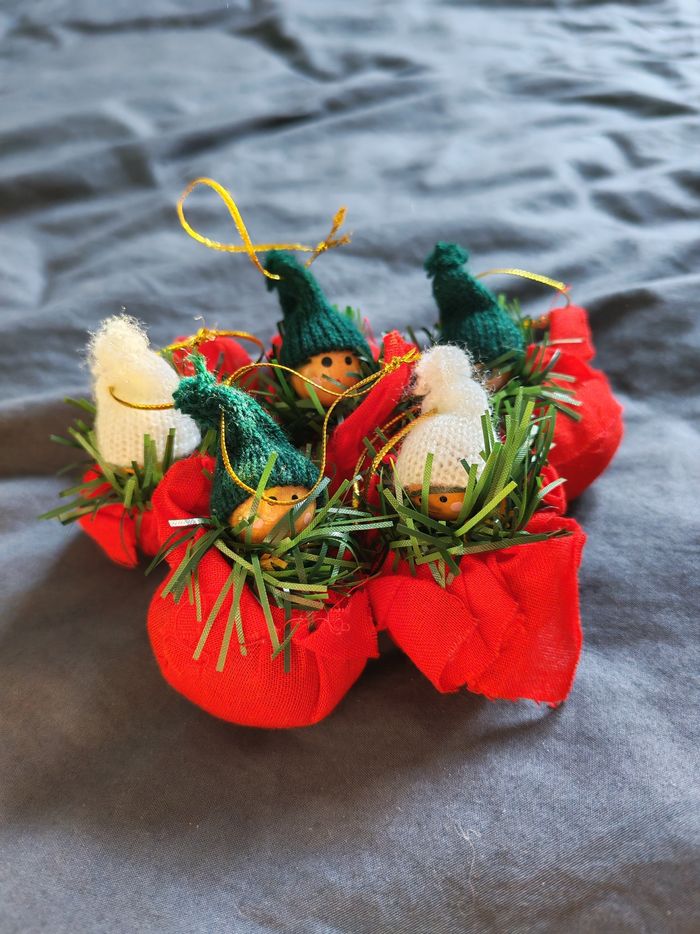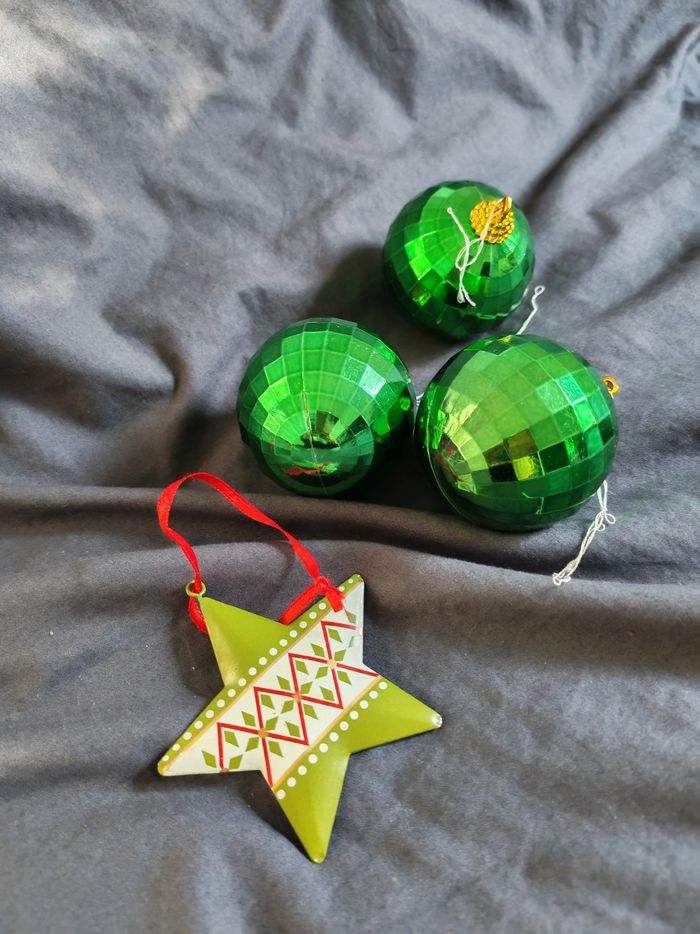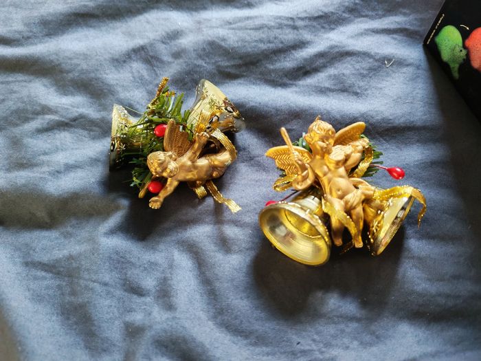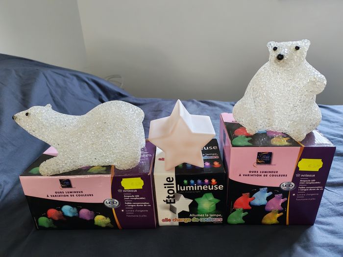 Lot déco de Noël : - 2 oursons lumineux + 1 étoile lumineuse (piles à changer dans l'Étoile) - 2 anges doré à accrocher - 4 étoiles à accrocher - 5 petits personnages à accrocher au sapin - divers déco à accrocher au sapin et autre